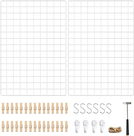 Draadgaas Fotowandset van 2 wanddecoratie Multifunctionele rooster Wandrooster Diy met S Hooks-klemmen en hennep Koord Wit 69 x 49 x 35 cm