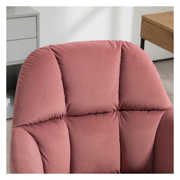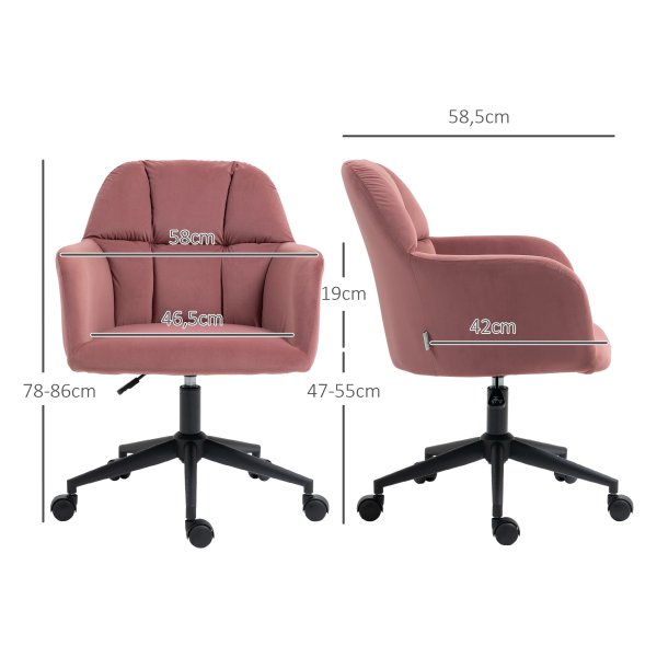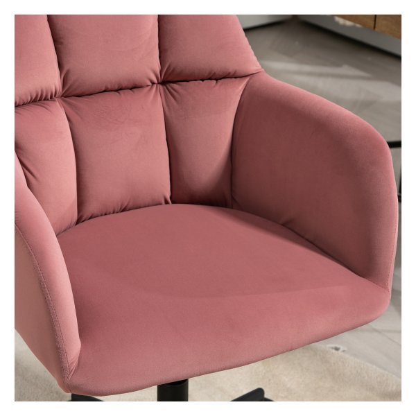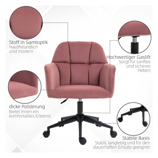 Bullet Point 2 | De Vinsetto bureaustoel is ontworpen als ideale metgezel voor uw thuiskantoor. Met een modern ontwerp en stijlvolle stiksels past deze stoel perfect in diverse inrichtingsstijlen. Verstelbaar in hoogte van 47 cm tot 55 cm, de bureaustoel biedt uitzonderlijk comfort met zijn zachte fluwelen bekleding. Met zwenkwielen en een draaibare zitting zorgt deze stoel voor optimale mobiliteit op de werkplek. Het roze ontwerp en materialen zoals fluweel en staal geven een luxe uitstraling, terwijl het maximaal belastbaar gewicht van 120 kg duurzaamheid garandeert. |