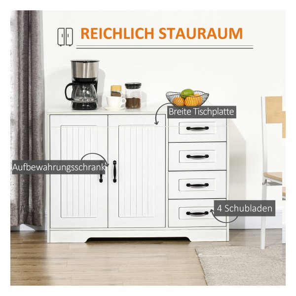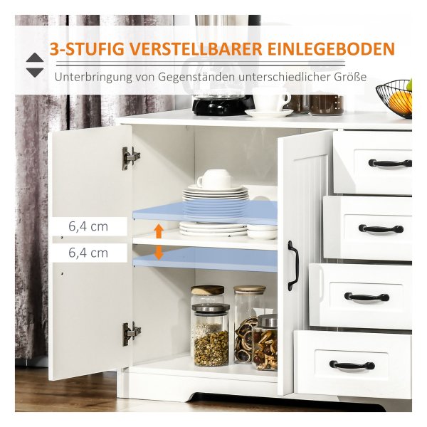 Dieses Beistellschrank in Weiß ist ein vielseitiges Möbelstück mit viel Stauraum. Das schlichte Design passt in jeden Raum und bietet Platz für tägliche Utensilien. Mit einem verstellbaren Regal und stabilen Konstruktion ideal als Dressoir für Ihr Zuhause.