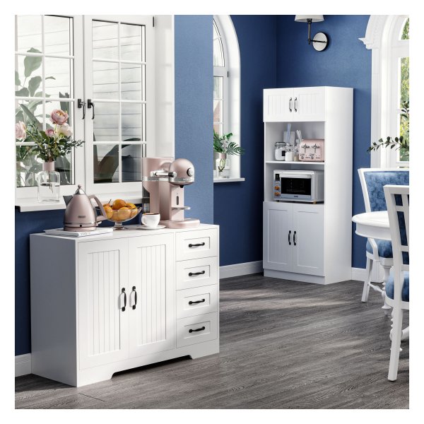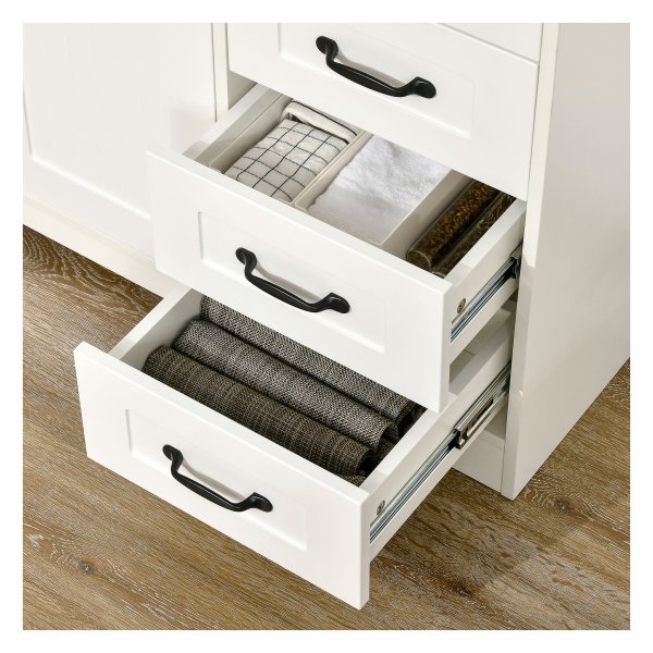 - Een voor alles: Serveerschalen bovenop, lepels in de laden en kookgerei in de opbergkast – alles is opgeborgen en blijft stofvrij. De witte deuren en nostalgische metalen handgrepen voegen een subtiel accent toe aan je huis.
