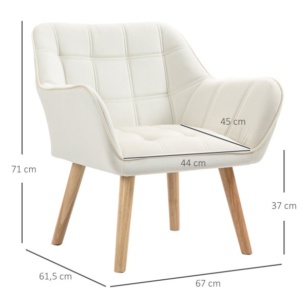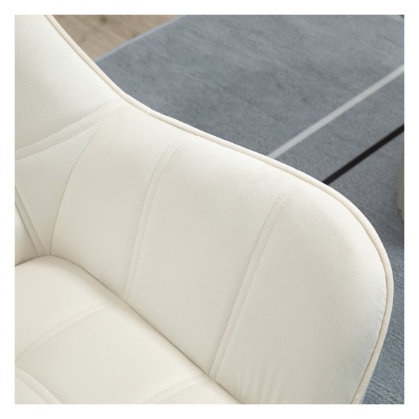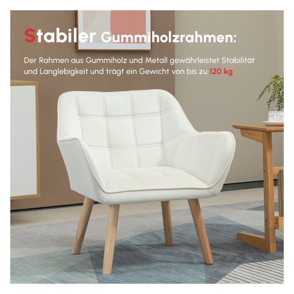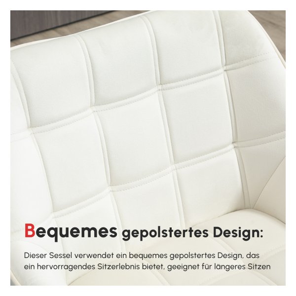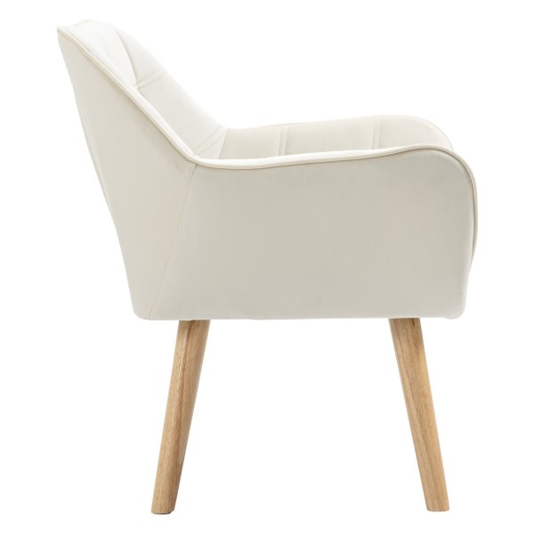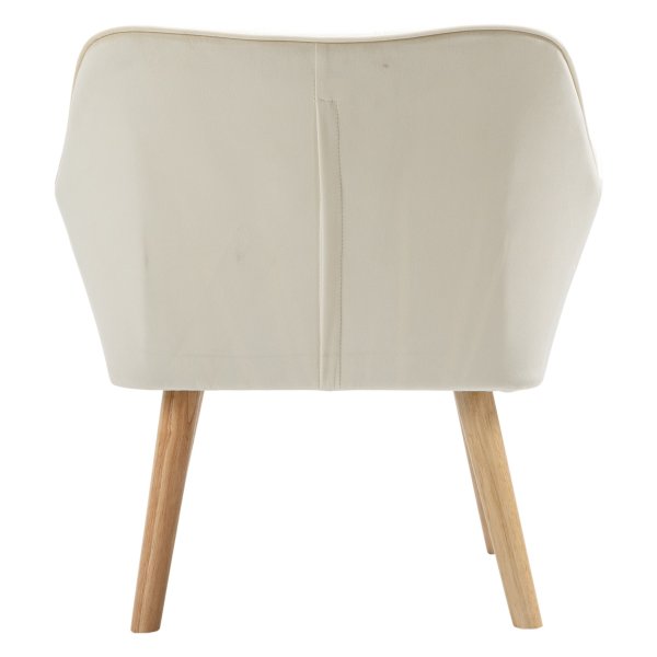 Bullet Point 1 | Met comfortabel gestoffeerd fluweel, fijne naden op zowel de zitting als de rugleuning, stevige rubberhouten poten en een metalen frame biedt deze Scandinavische loungestoel in crmewit niet alleen een moderne uitstraling, maar ook een robuuste ondersteuning voor een ontspannen leeservaring in uw kleine hoekje. |