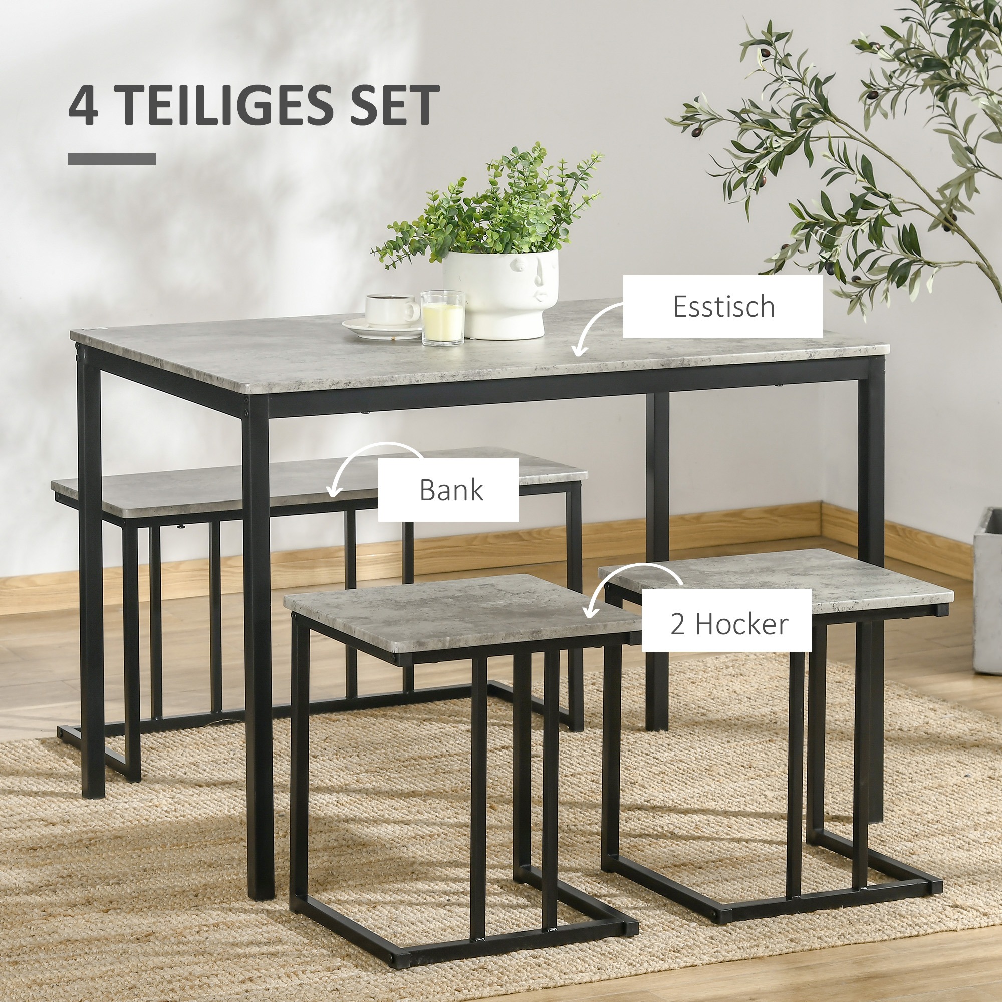 De compacte HOMCOM eetkamerset in grijs en zwart is ideaal voor kleine ruimtes. Het set bestaat uit tafel, bank en 2 krukken, biedt ruimte voor 4 personen en is gemakkelijk op te bergen. Met stevige materialen en een modern design.
