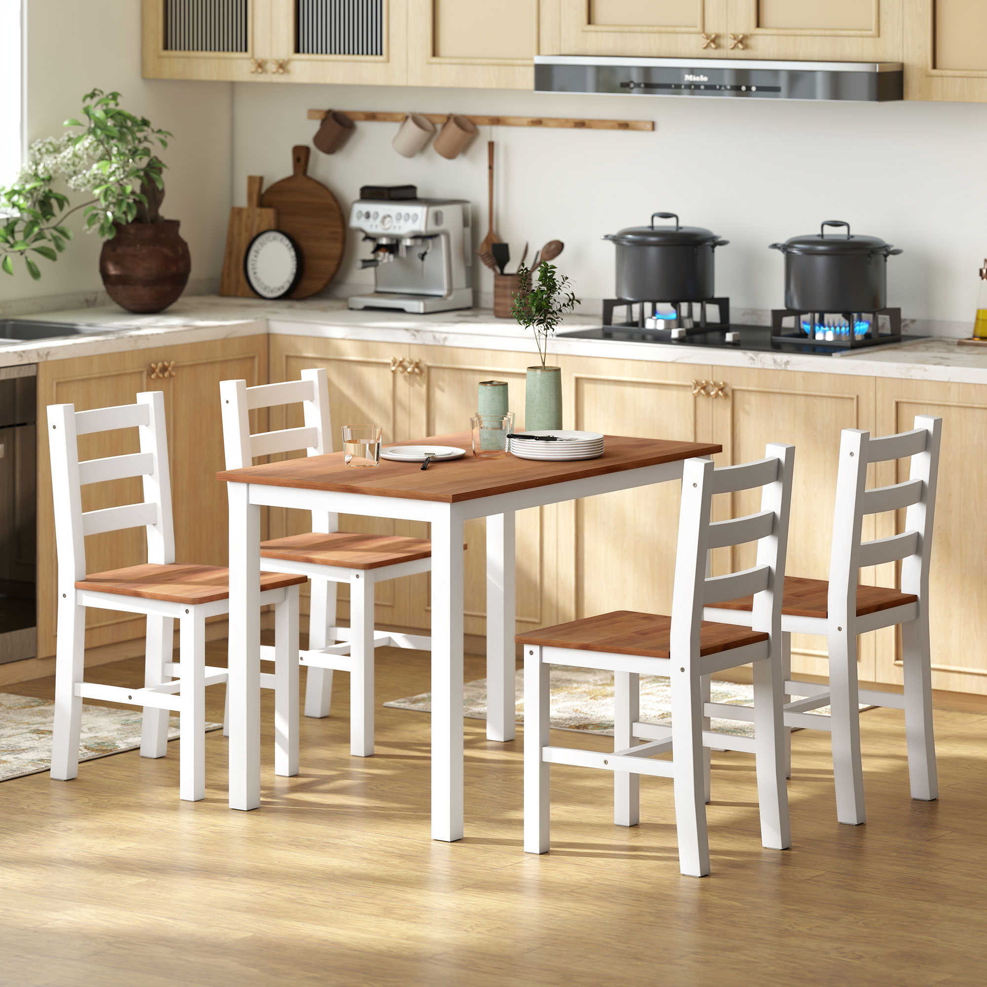 - Rustieke boerderijstijl: Deze eetkamerset presenteert een warm houten tafelblad en zitvlakken, aangevuld met strakke, witte frames. Het geeft elke keuken- of eetruimte een gezellige, landelijke uitstraling