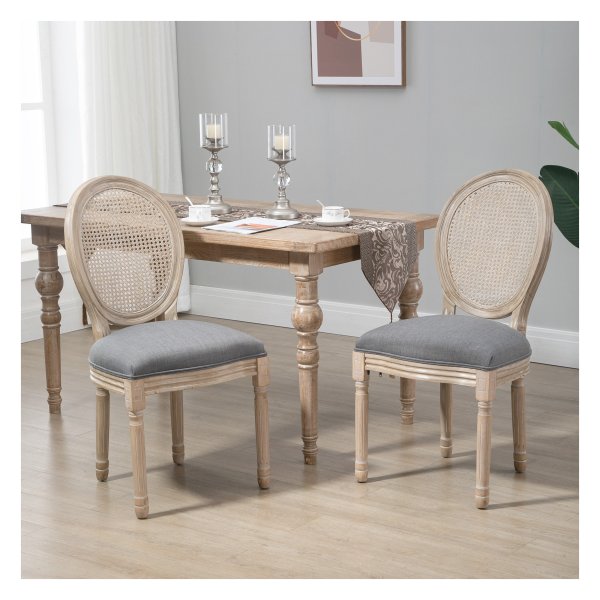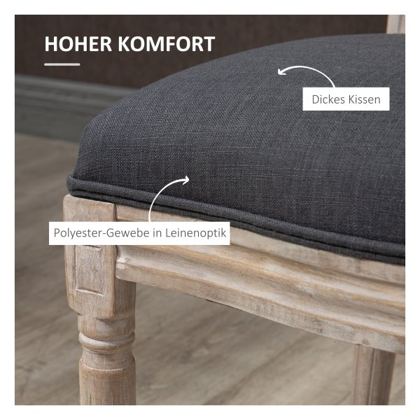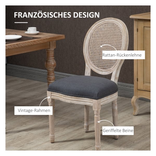 Bullet Point 2 | Verfraai uw huis met elegantie met deze twee eetkamerstoelen van HOMCOM. De stoelen hebben een stijlvol ontwerp met een rugleuning van fijn gevlochten polyrattan en decoratieve houten poten, waardoor ze perfect passen in de keuken, eetkamer of woonkamer. Ze zijn ideaal om gezellige momenten aan tafel met vrienden en familie door te brengen en voegen een stijlvol accent toe aan elke ruimte. De stoelen zijn verkrijgbaar in een set van twee en zijn eenvoudig te monteren. Ze hebben een tijdloos houten design dat past bij verschillende interieurstijlen en bieden uitstekend zitcomfort dankzij de zachte bekleding en fluweelachtige afwerking. Met stevige houten poten en een draagvermogen van 120 kg zijn ze ook stabiel en duurzaam. De stoelen zijn grijs van kleur, gemaakt van polyester en rubberhout, en hebben specificaties zoals afmetingen, zithoogte en maximale belasting. De set wordt geleverd met twee stoelen en een montagehandleiding. |