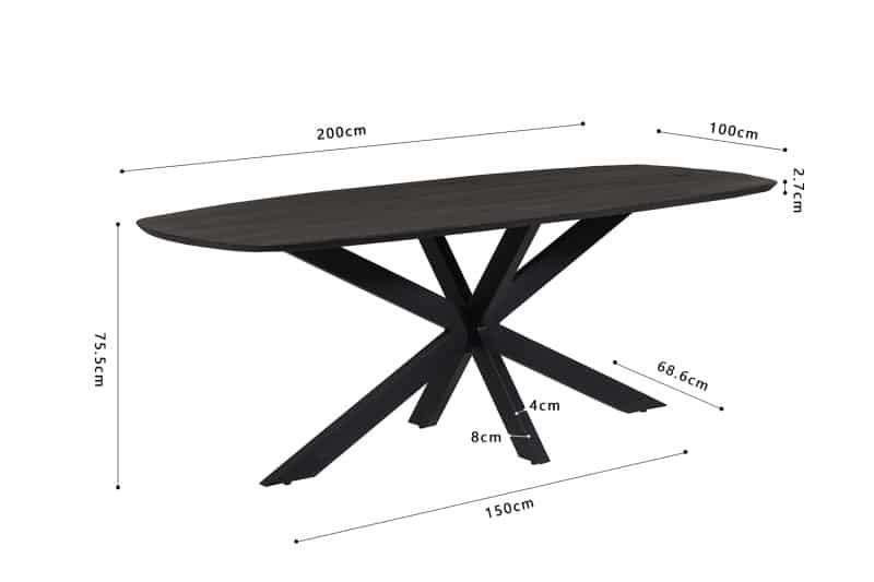 | Bullet Point 2 | – – De eettafel 'Isabella' 200 cm met spider-poot en ovaal mangolia zwart design is een elegante en functionele keuze voor moderne woonruimtes. – Gemaakt met materialen zoals structuur metaal en blad exotisch hout mangolia voor duurzaamheid en comfort. – Met afmetingen van H-H 76 x B-L 200 x D-P 100 cm – Top 45 mm en een gewicht van 47.0 kg past deze tafel perfect in de moderne levensstijl en ieder interieur. |