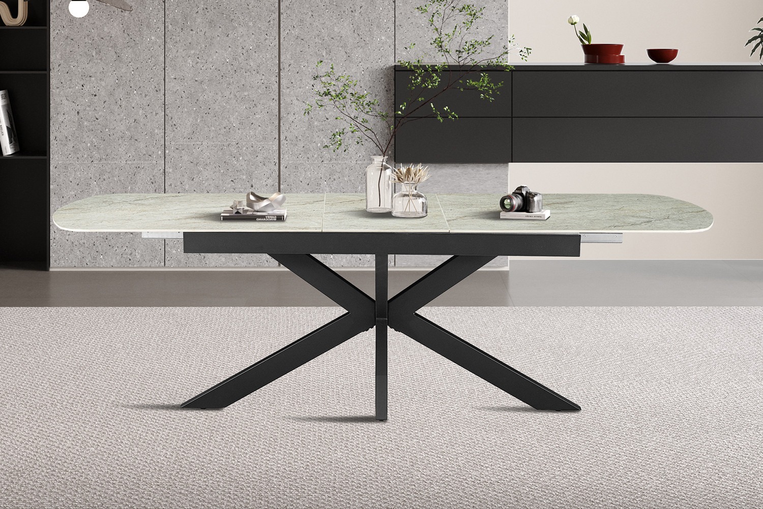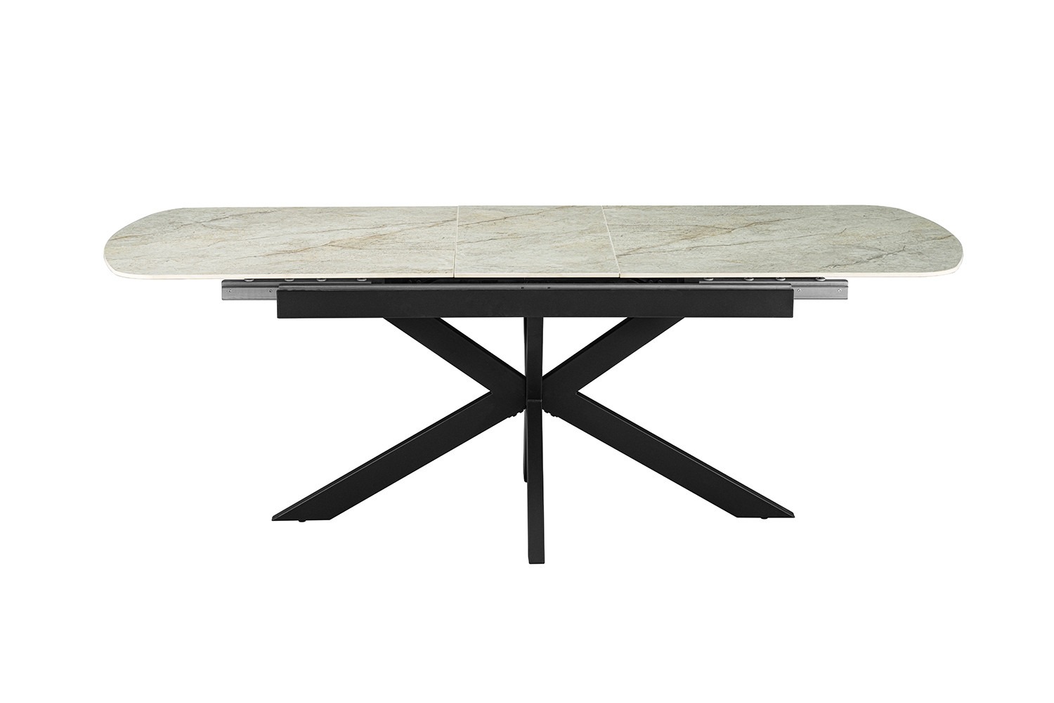 De eettafel ‘Hestia’ is een uitschuifbare Deense tafel met een glanzend stenen beige ovaal blad. Afmetingen zijn H 76 x B-L 180-220 x D-P 90 cm. Topdikte is 11 mm.