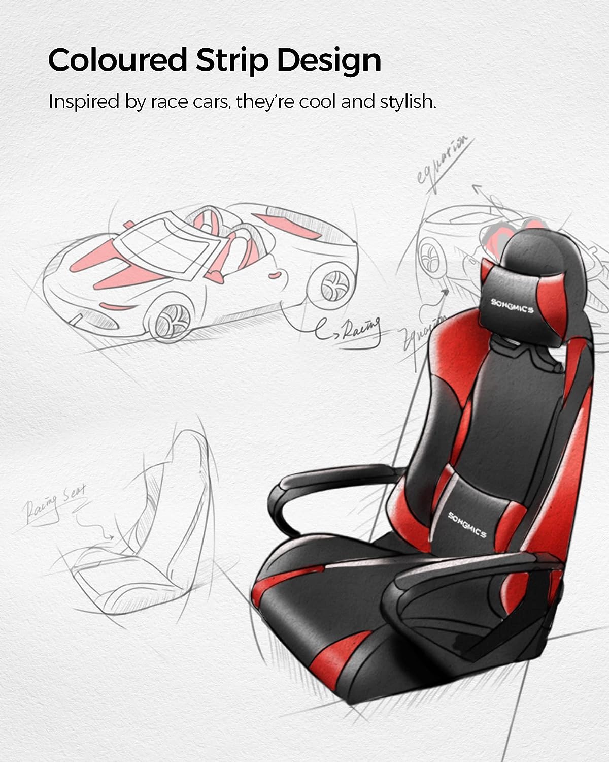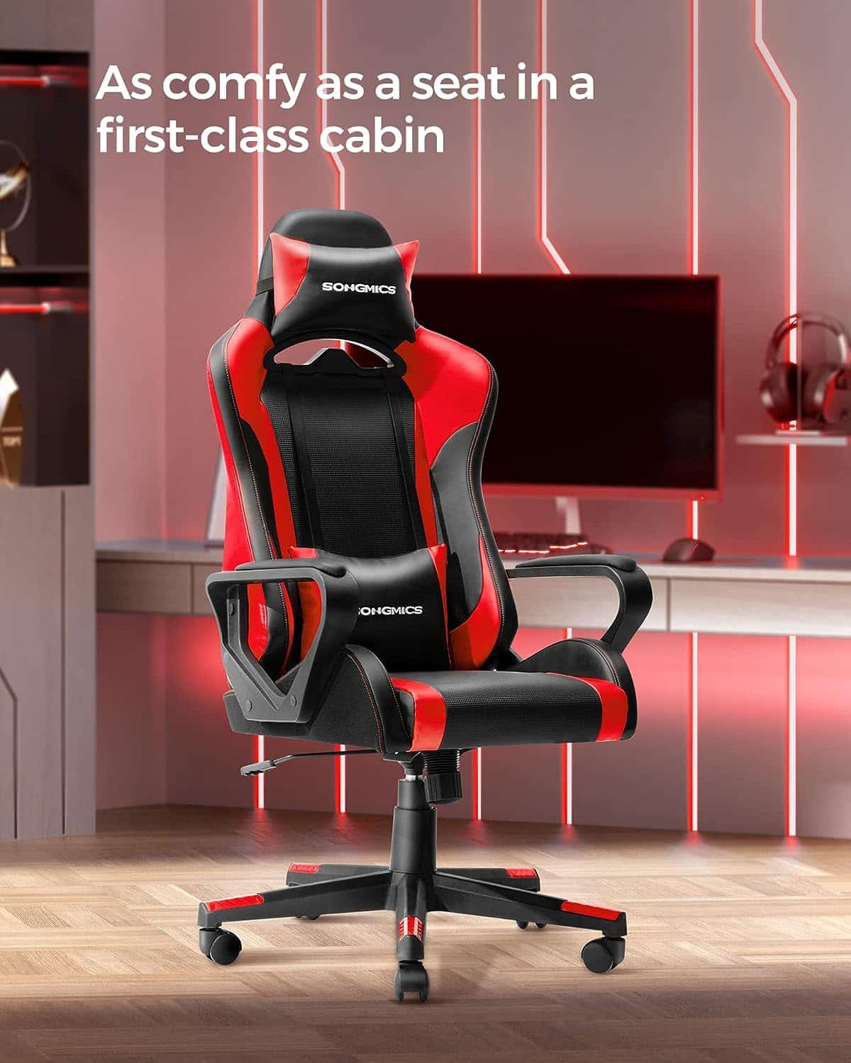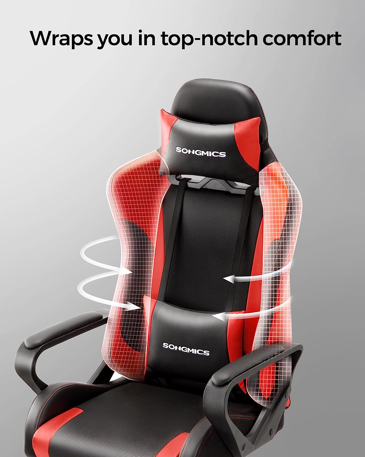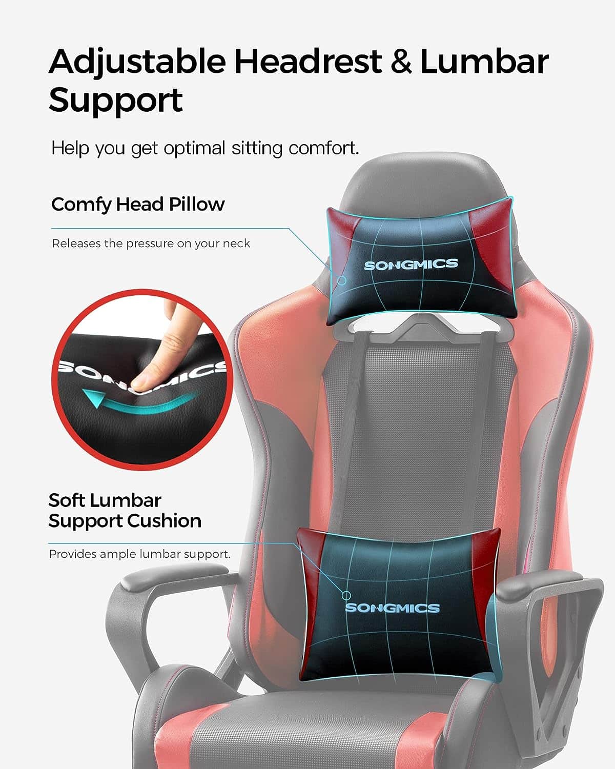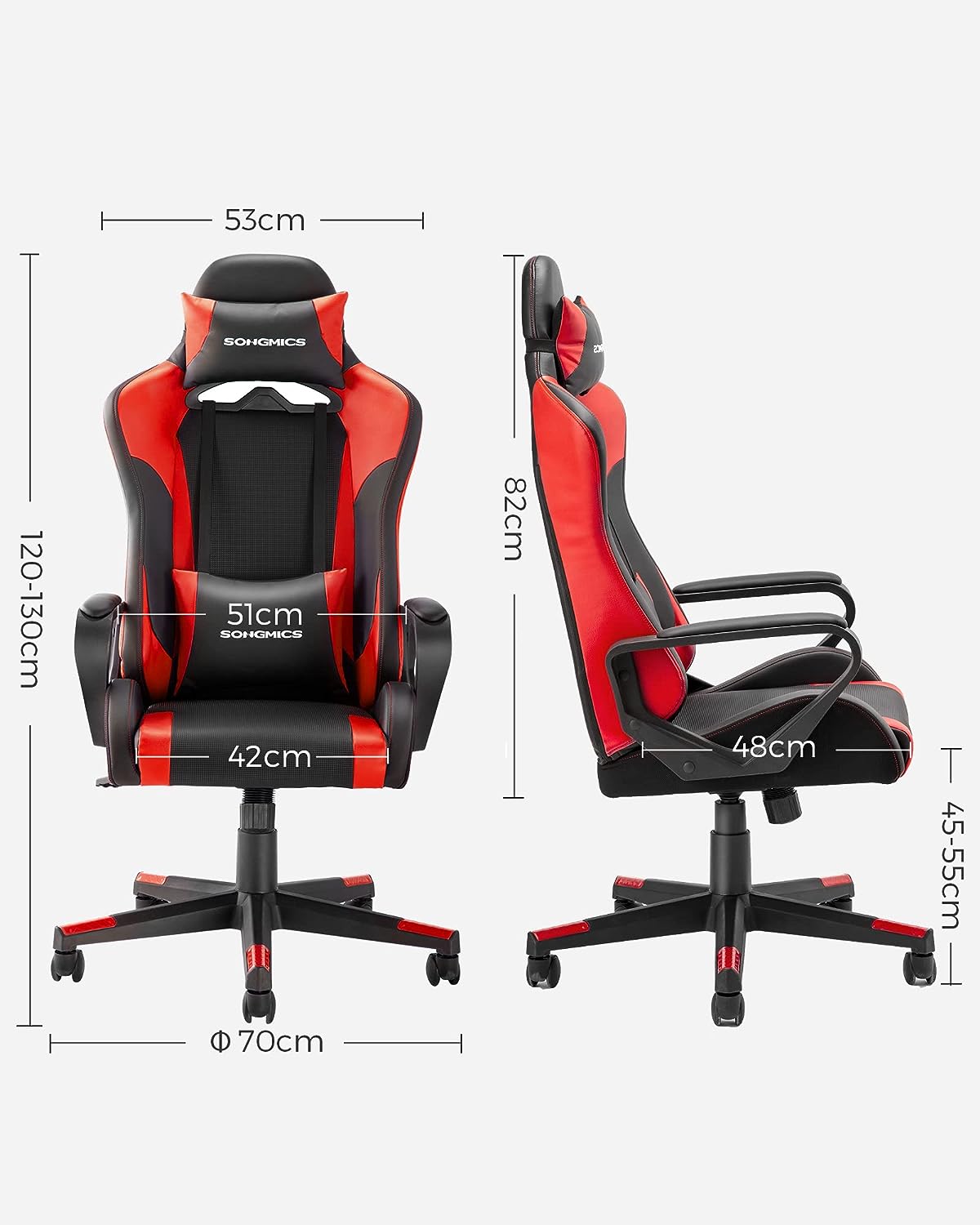 Ergonomische Gamingstoel Met Afneembare Hoofdsteun, Lendenkussen, In Hoogte Verstelbaar, Wipfunctie, Belastbaar Tot 150 Kg, Zwart-Rood