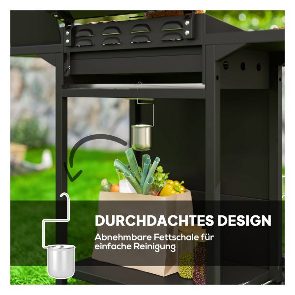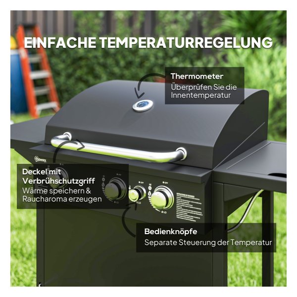Mit dem Outsunny Gasgrill können Sie bis zu 9 Personen eine leckere Mahlzeit zaubern. Dank der Vielzahl an Features wie einem Seitenbrenner und individuell zündbaren Brennern bleibt das Grillen eine einfache und unterhaltsame Tätigkeit. Der Gasgrill bietet einen großen Grillbereich, vielseitige Aufbew.