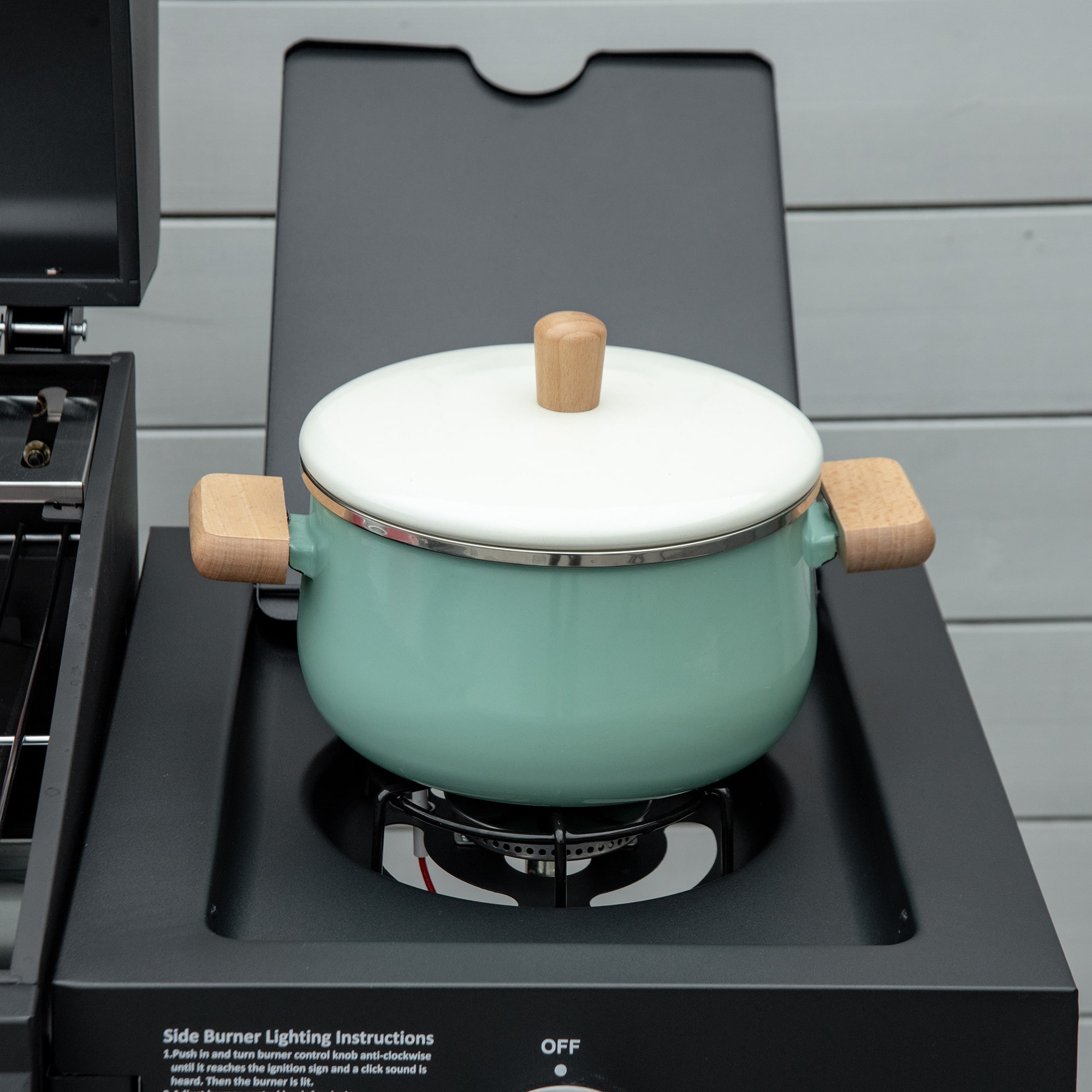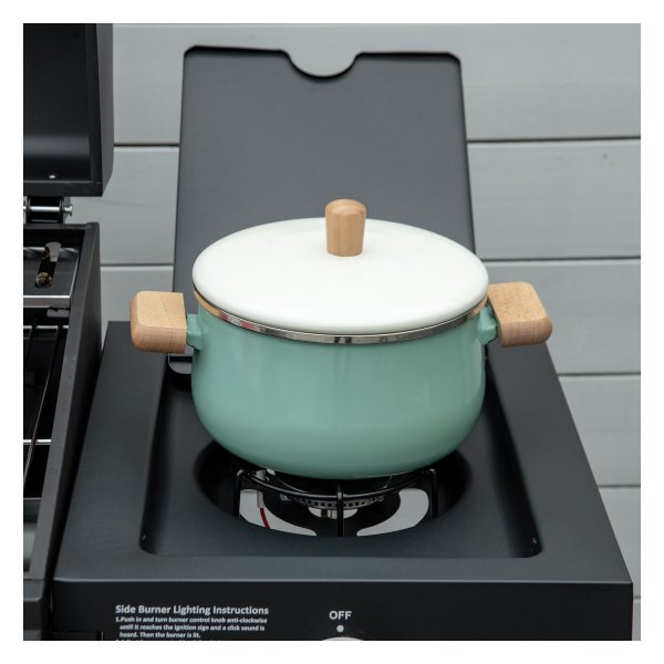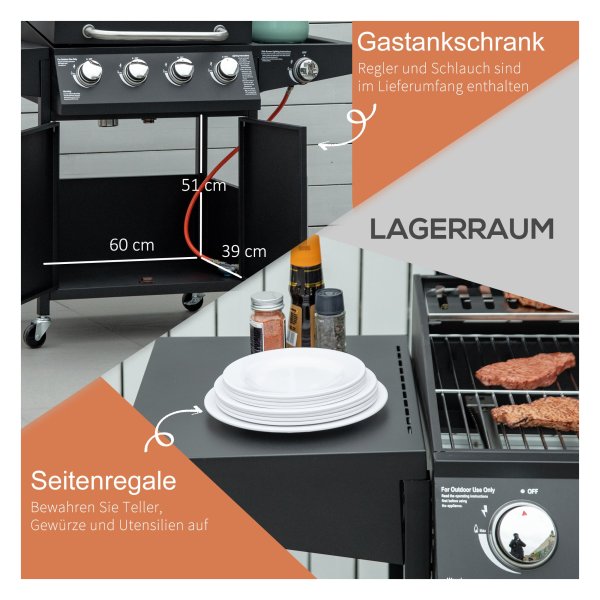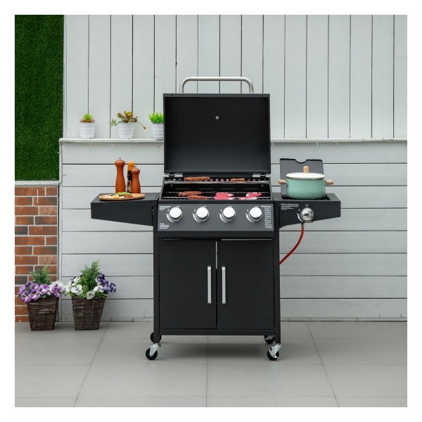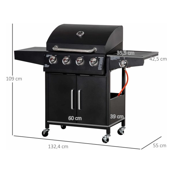 Deze barbecuekar beschikt over 3 krachtige branders met elk een vermogen van 3 kW, waardoor je verzekerd bent van een gelijkmatige en krachtige hitteverdeling. Hierdoor kun je moeiteloos grote maaltijden bereiden voor al je vrienden en familie. Bovendien wordt de BBQ geleverd met een drukregelaar, slangen en een handige opbergruimte voor al je barbecue-accessoires.