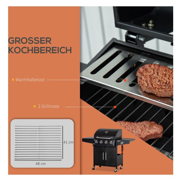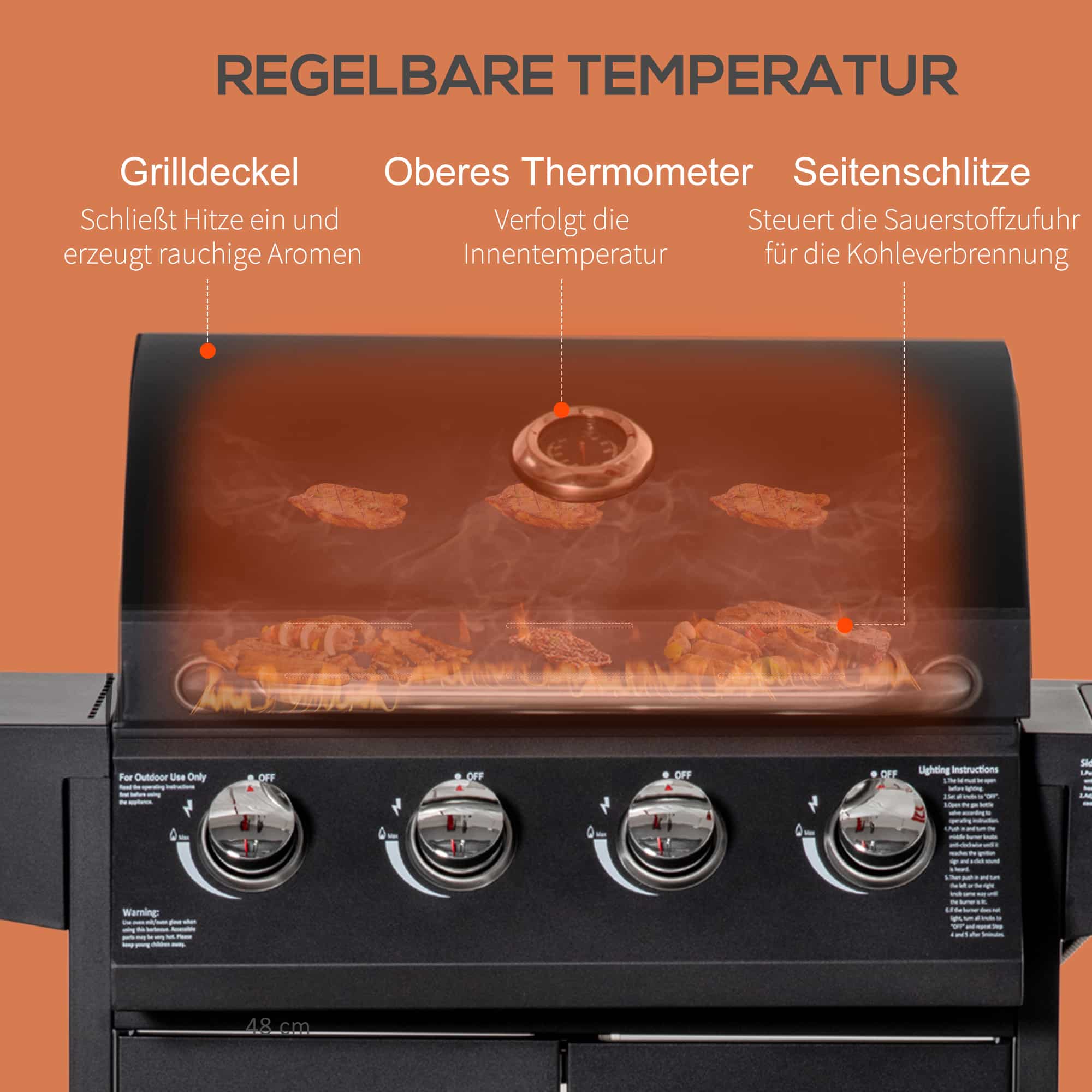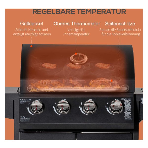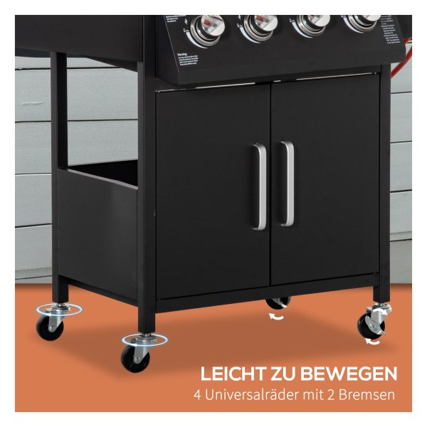 Dankzij de 4 stevige wielen is deze barbecuekar eenvoudig te verplaatsen, zodat je altijd de perfecte plek kunt kiezen om te grillen. De bijzettafels aan de zijkanten van de grill bieden extra werkruimte voor het voorbereiden van je gerechten en het plaatsen van je favoriete kruiden en sauzen.