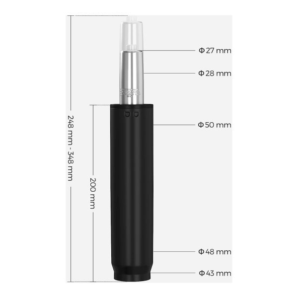 Deze gasveer voor bureaustoelen is een gasdrukdemper met een belastbaarheid van 200 kg. De gasveer is geschikt voor gamingstoelen, managersstoelen en andere bureaustoelen. De gasveer heeft een lengte van 255 mm en is zwart van kleur.