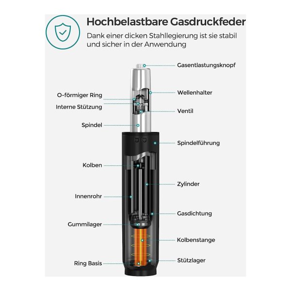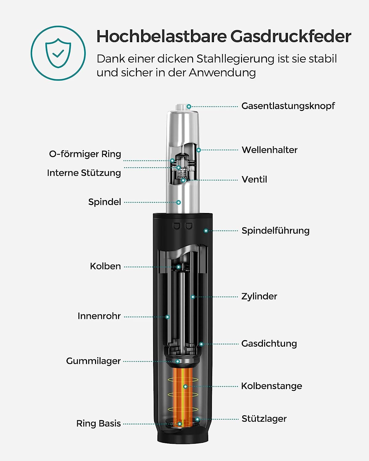 De gasveer is ook voorzien van een veiligheidsmechanisme dat voorkomt dat de stoel te ver naar beneden gaat. Dit maakt de gasveer geschikt voor gebruik in kantoren, thuis en andere omgevingen.