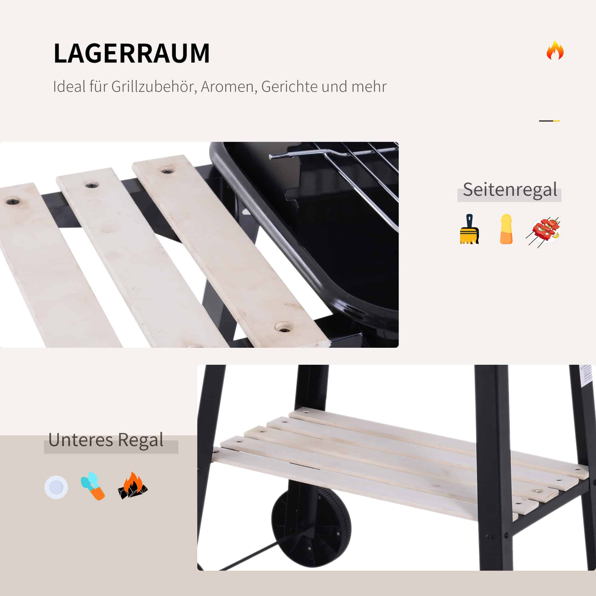 Daarnaast heeft de barbecuekar meerdere opbergvakken waarin u al uw barbecue-benodigdheden kunt opbergen. Deze opbergvakken zijn in hoogte verstelbaar, zodat u altijd de perfecte werkhoogte kunt creëren.