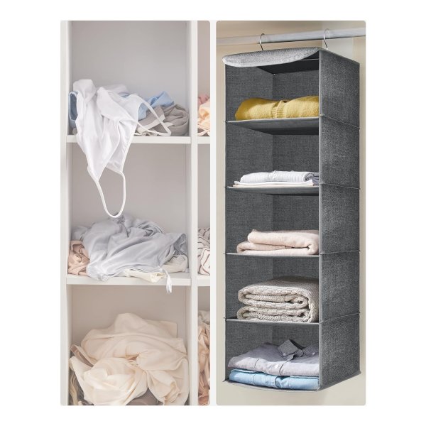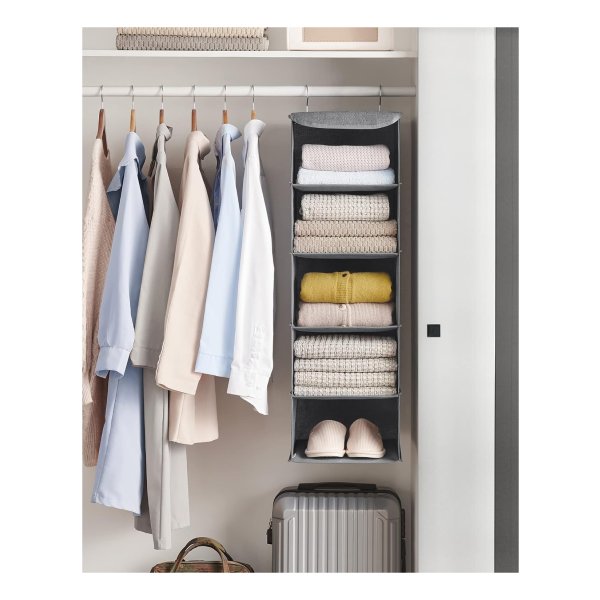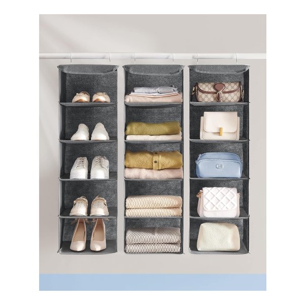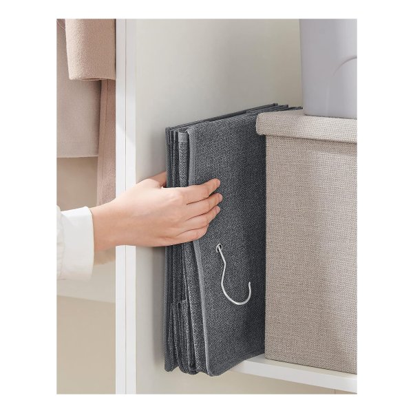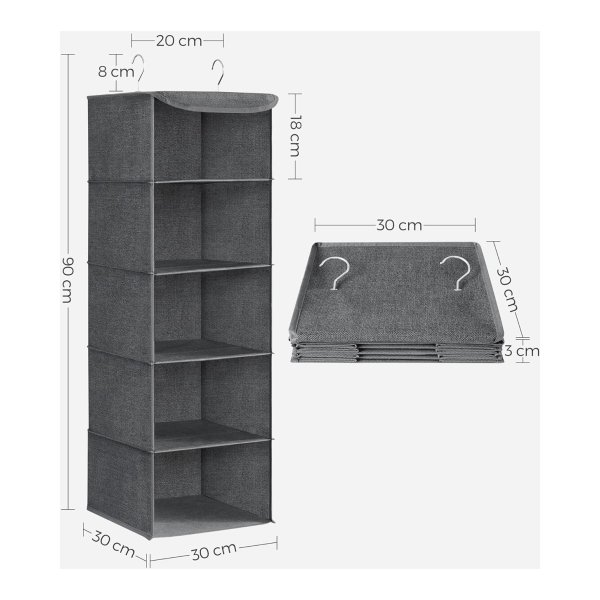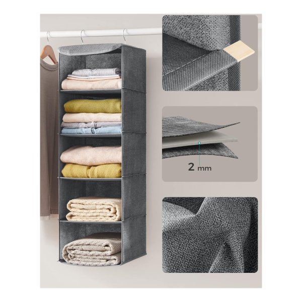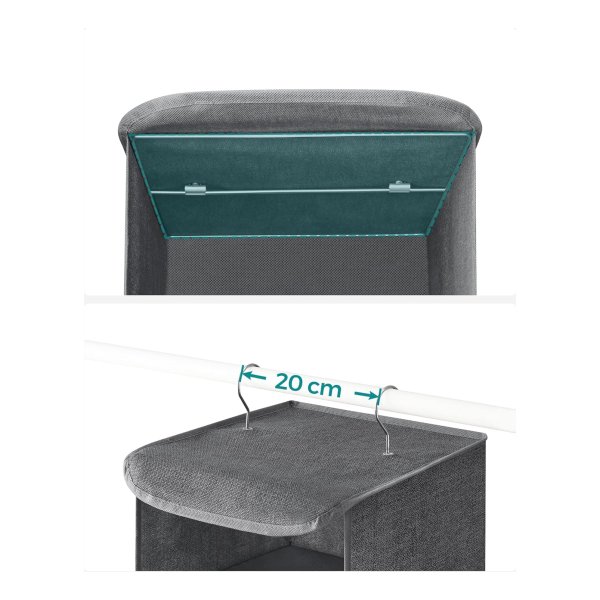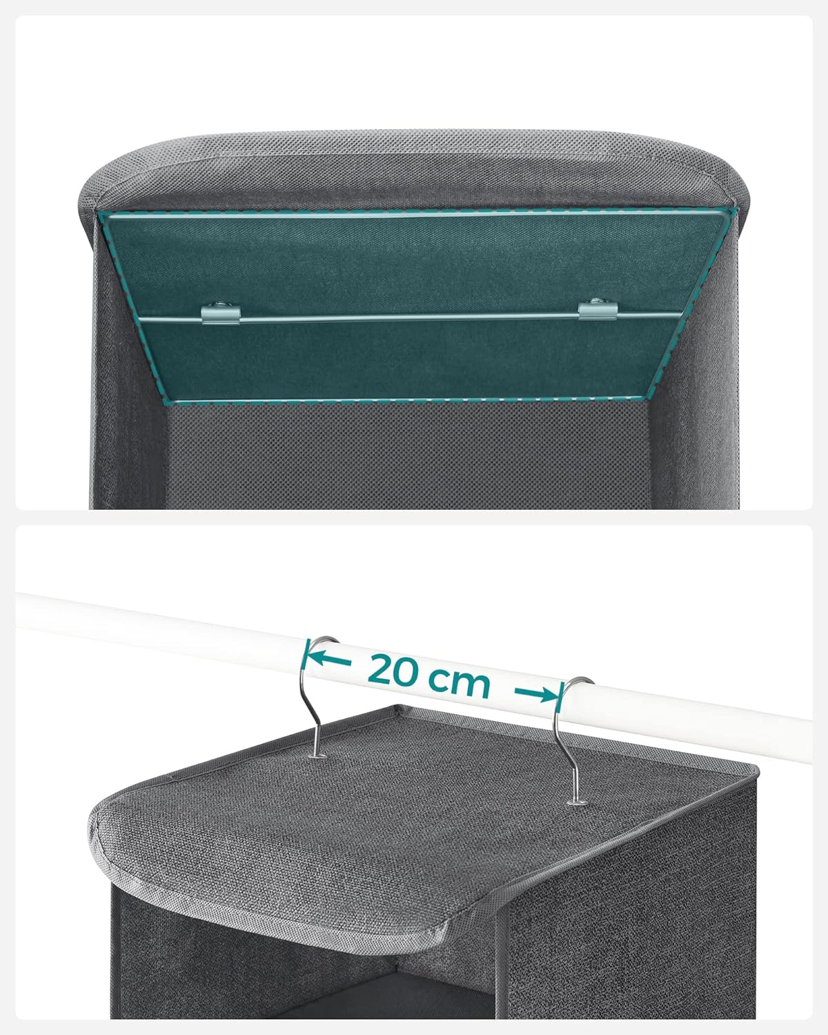 Hangende organizer, kastorganizer, hangende plank, hangende opslag, opvouwbaar en ruimtebesparend, metalen haken en bamboe inzetstukken, linnenachtige textuur, grijs