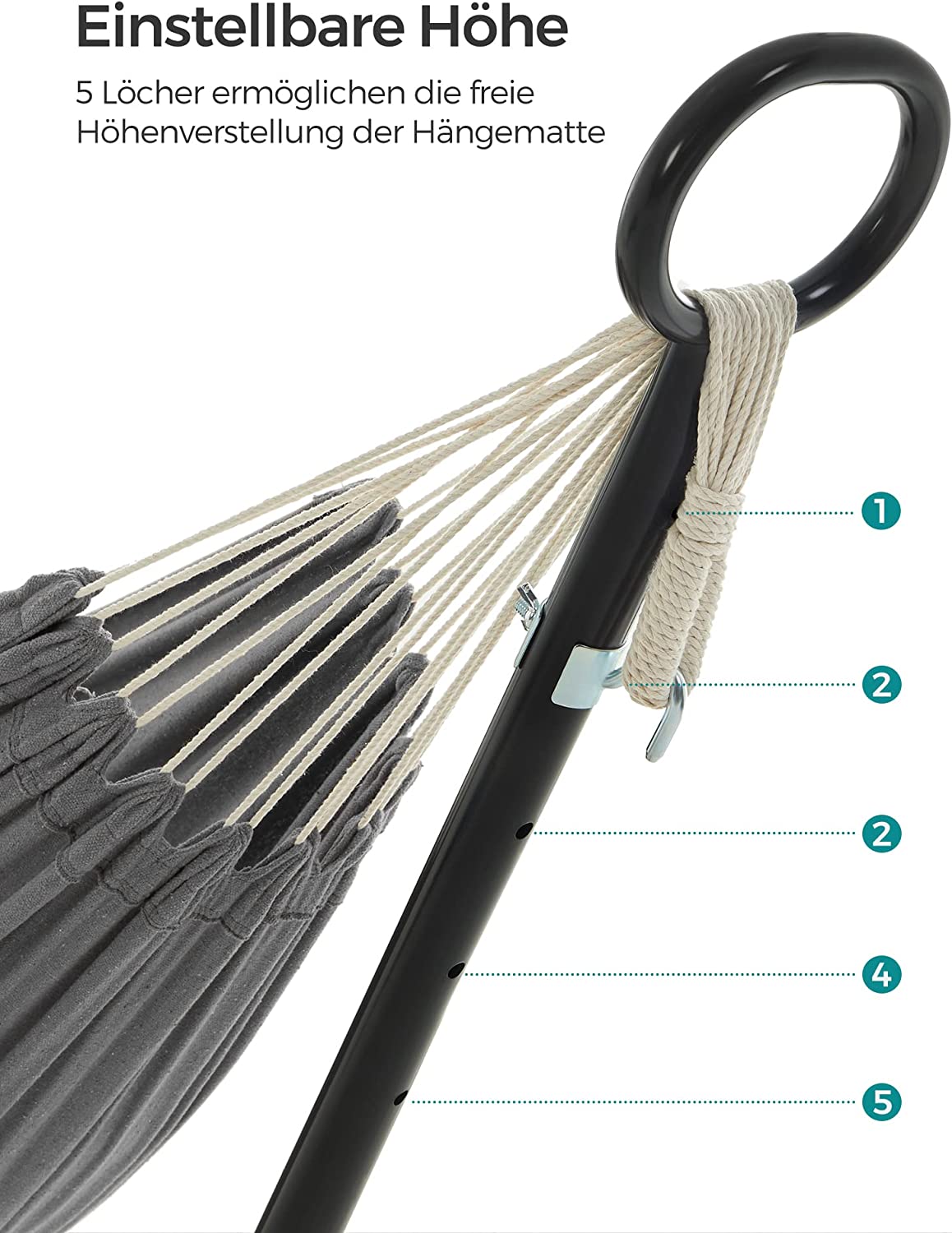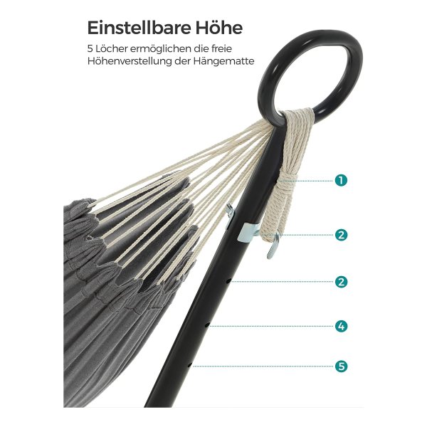 In hoogte verstelbaar: er zijn 5 gaten aan elke kant van de steunstang, zodat je de hoogte van de hangmat naar wens kunt instellen
