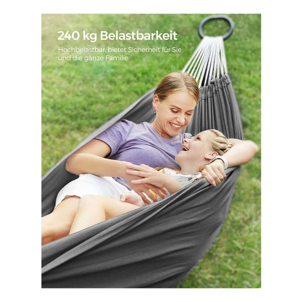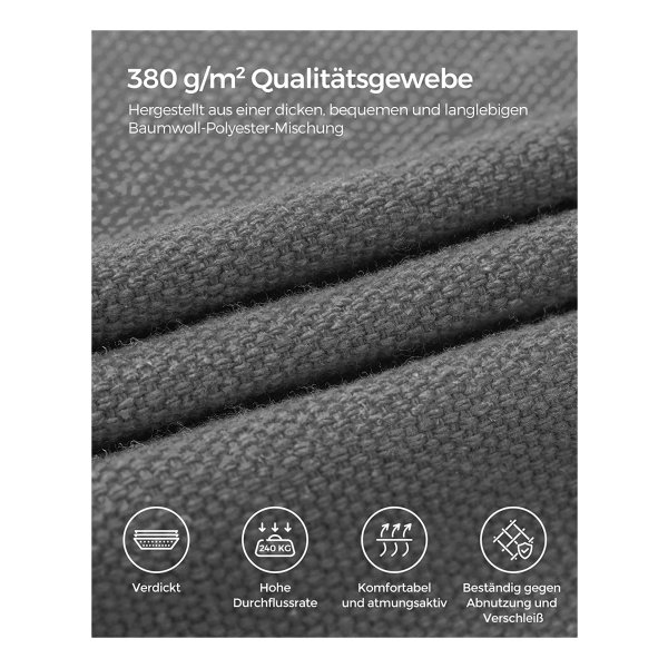 Ademend en comfortabel: de hangmat bestaat uit 380 g/m² scheurvaste stof, die duurzaam, ademend en comfortabel is en je lichaam stabiel omhult, zodat je je daarin kunt ontspannen