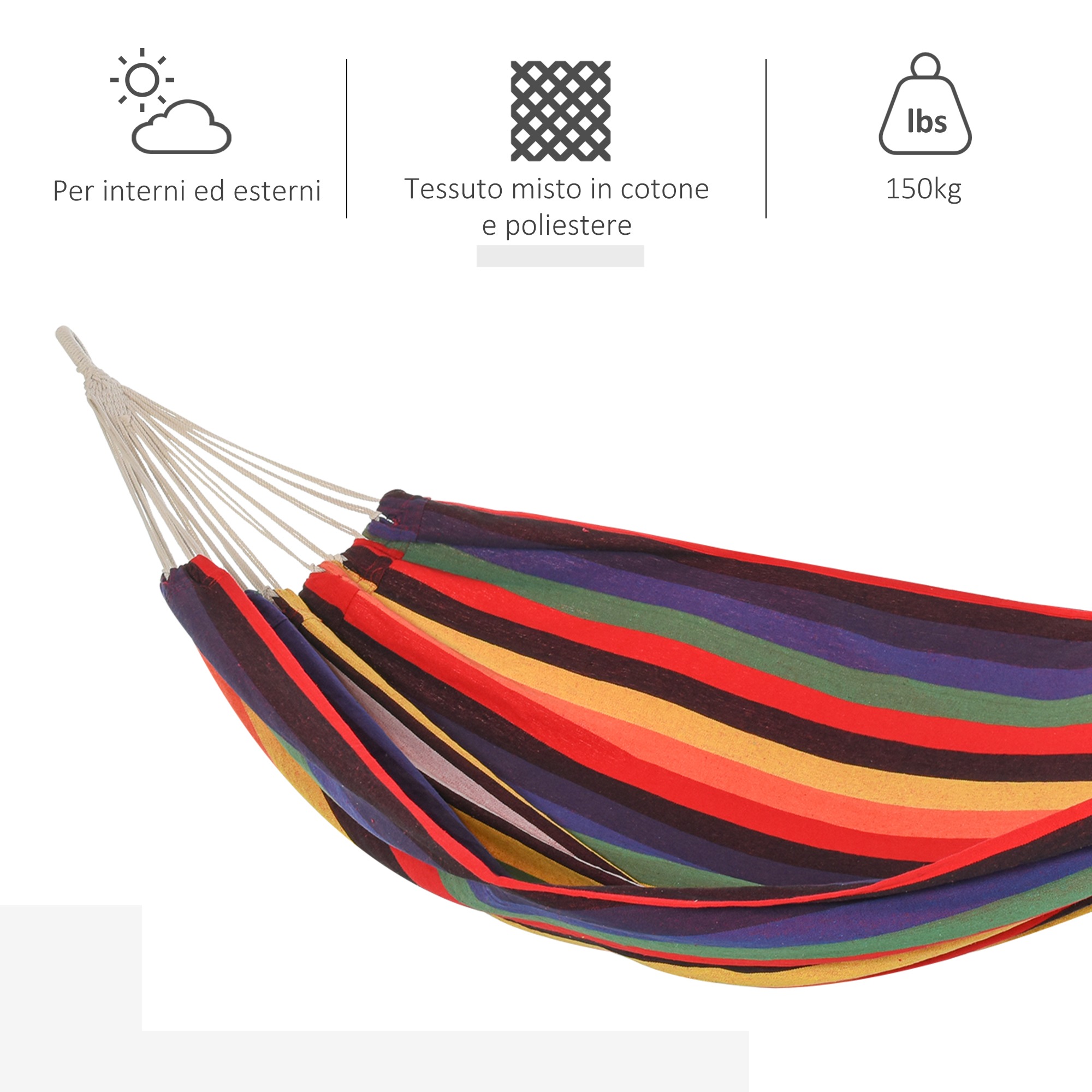Outsunny’s farbenfrohe Hängematte mit handgemachten Knoten und sommerlichem Design lädt zum Entspannen ein. Aus Baumwolle und Polyester, leicht transportierbar und ideal für Garten oder Park. Maße: 290L x 150B cm, Belastbarkeit: 120 kg.