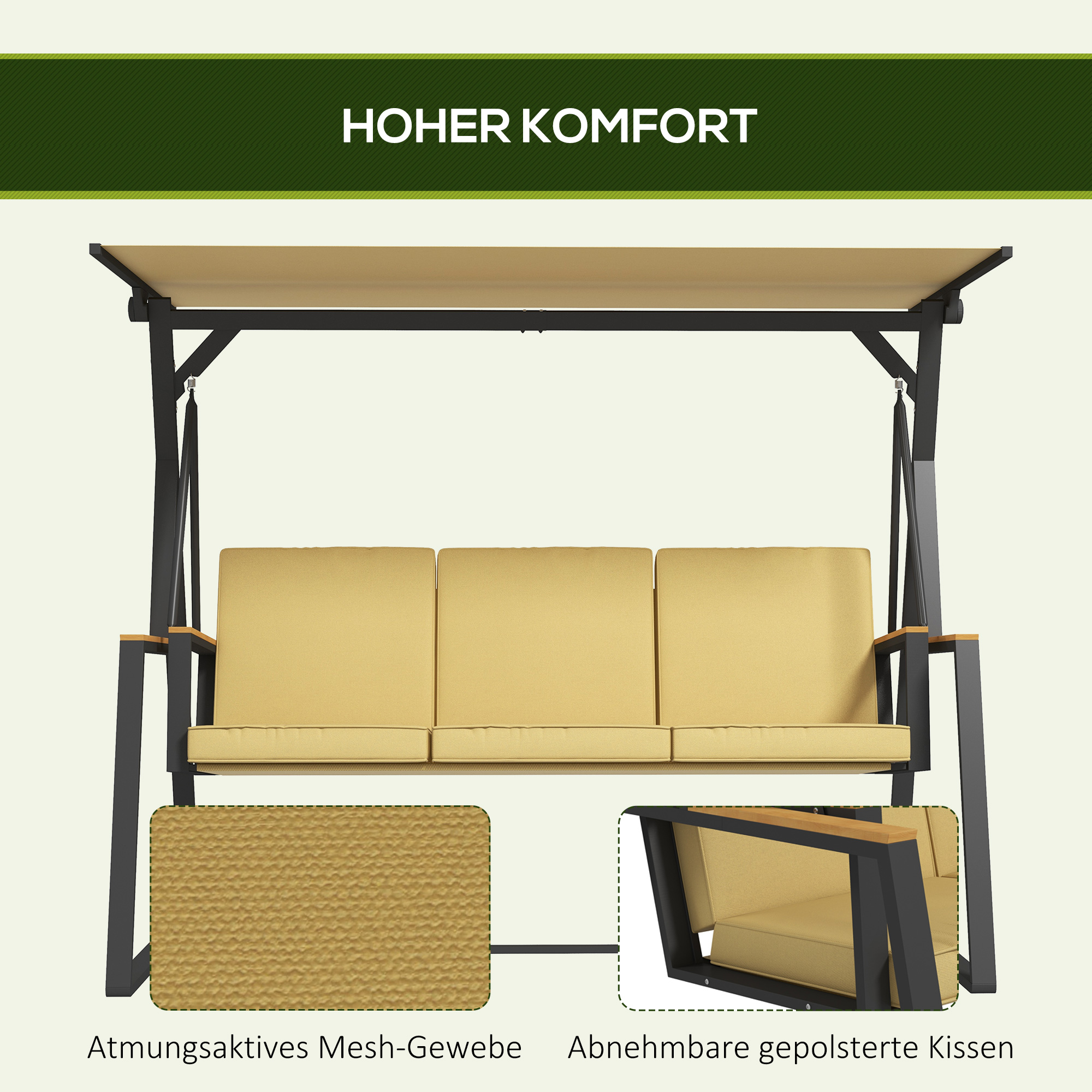 | Bullet Point 1 | 3-zitsschommel: Geniet samen met je lievelingspersoon van maximaal comfort op de 151 cm brede zitting die tot 300 kg kan dragenVerstelbare zonnekap: Deze 3-persoonsschommel met zonnekap houdt je koel en zorgt voor schaduw op zonnige dagen |