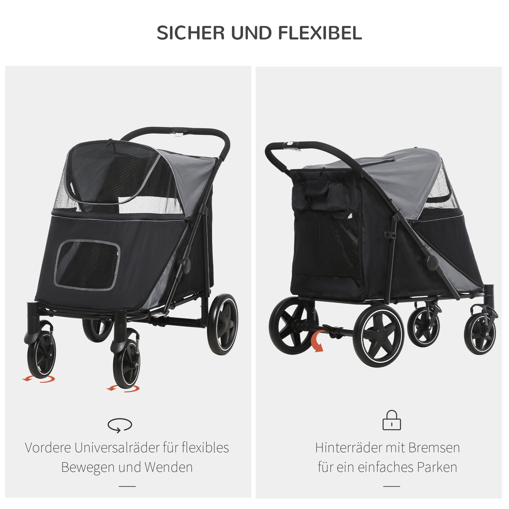 Deze grijze hondenbuggy is gemaakt van duurzame en stevige Oxford-stof, waardoor hij bestand is tegen dagelijks gebruik en langdurige avonturen met je harige metgezel. Daarnaast beschikt de buggy over handige opbergtassen waarin je al je reisbenodigdheden kunt meenemen, zodat je altijd goed voorbereid op pad gaat.