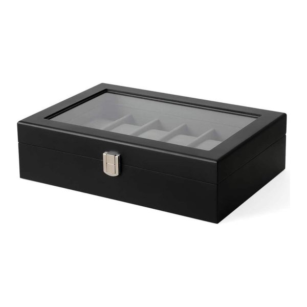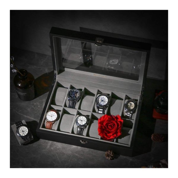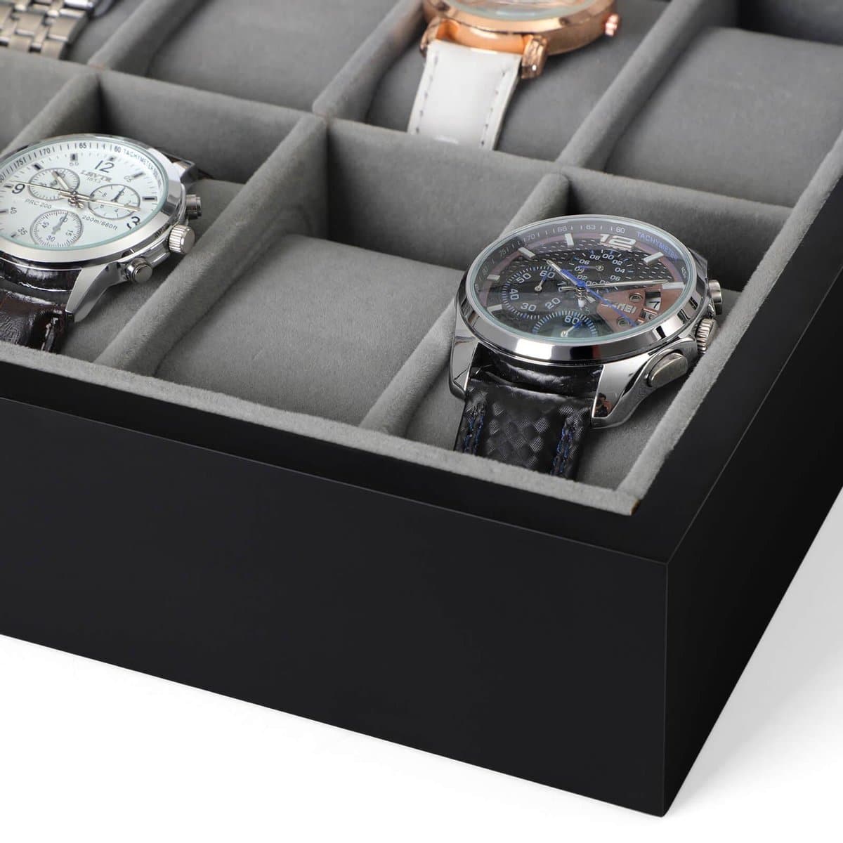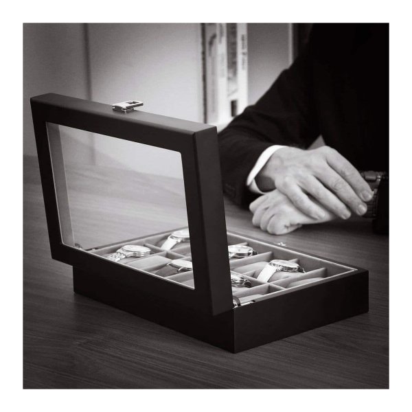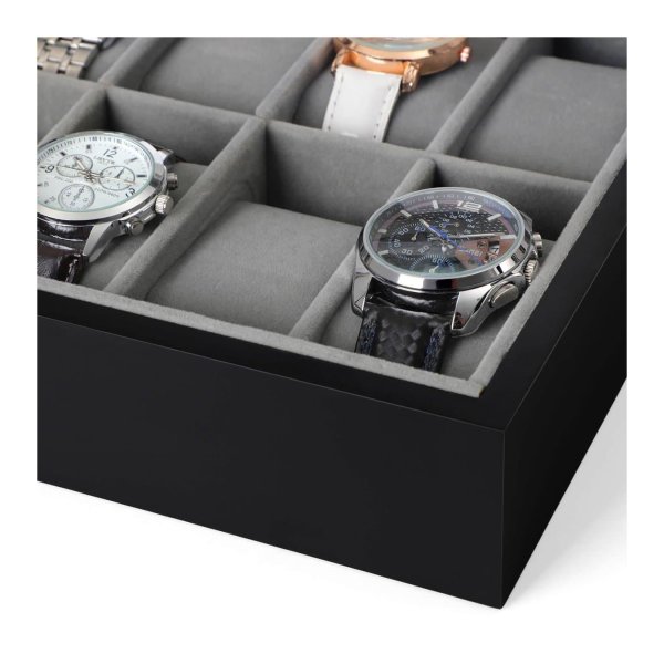Deze luxueuze Horlogedoos is een ware blikvanger met zijn edele design van houten vezelplaat, luxueuze fluwelen binnenvoering in grijs en mat zwarte afwerking. Of je nu een beginnende horlogeverzamelaar bent of een doorgewinterde horlogeliefhebber, deze box met 12 vakken voldoet aan al je wensen. De perfecte opslagplaats voor al je kostbare horloges.