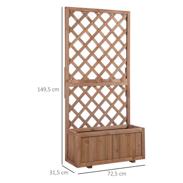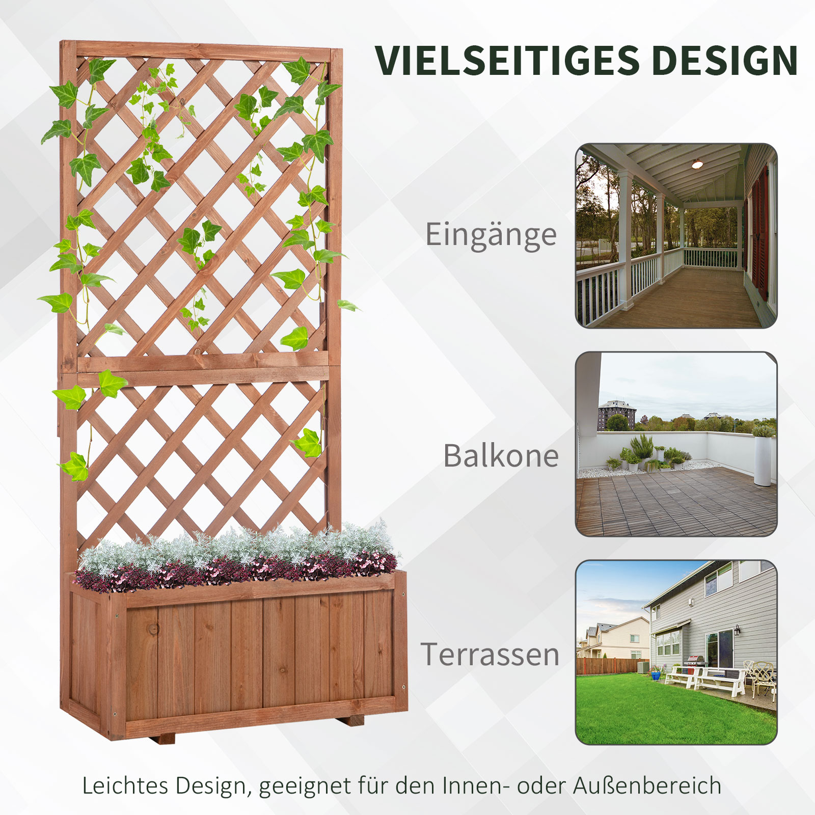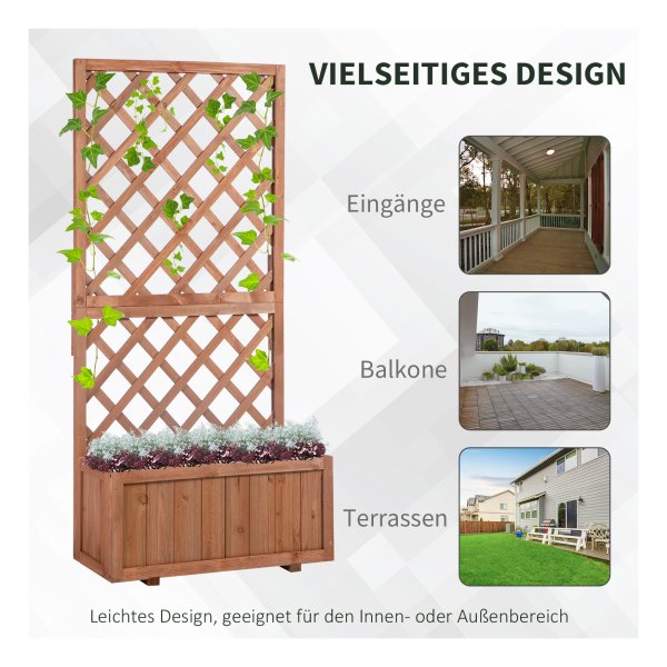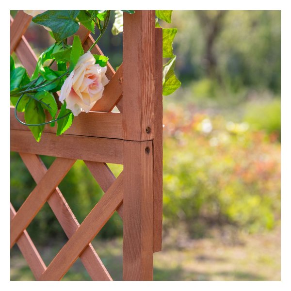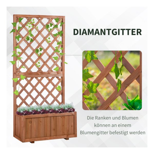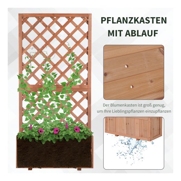 De bloembak is vervaardigd van hoogwaardig dennenhout voor duurzaamheid en stevigheid. Het natuurlijke hout zorgt voor een warme uitstraling en past goed bij elke tuininrichting. De bloembak is voorzien van een espalier waar klimplanten zoals klimrozen of clematis prachtig tegen kunnen groeien, waardoor je een groene en levendige sfeer creëert.