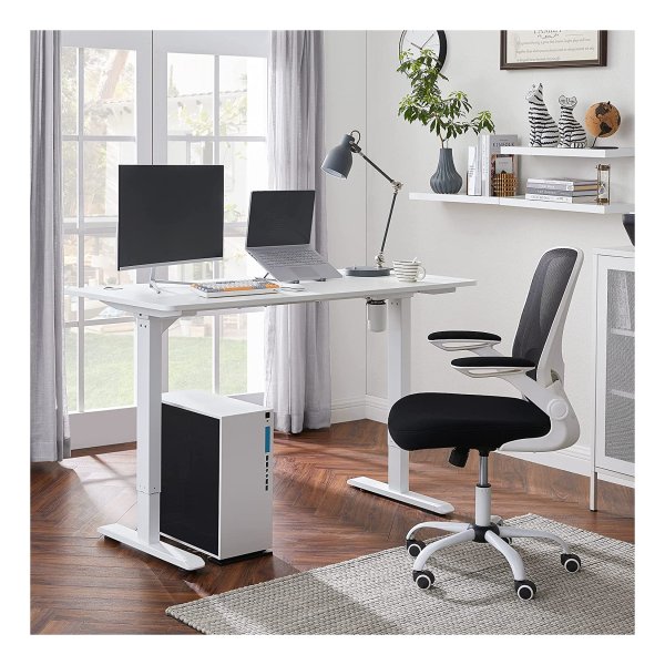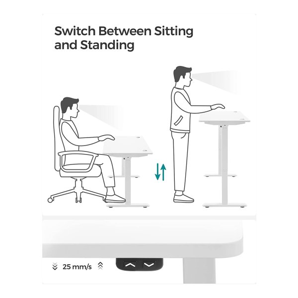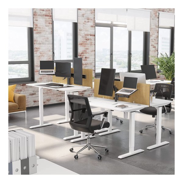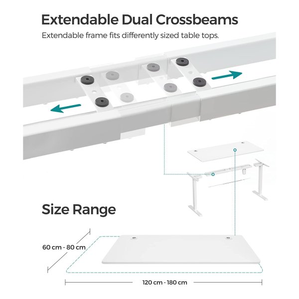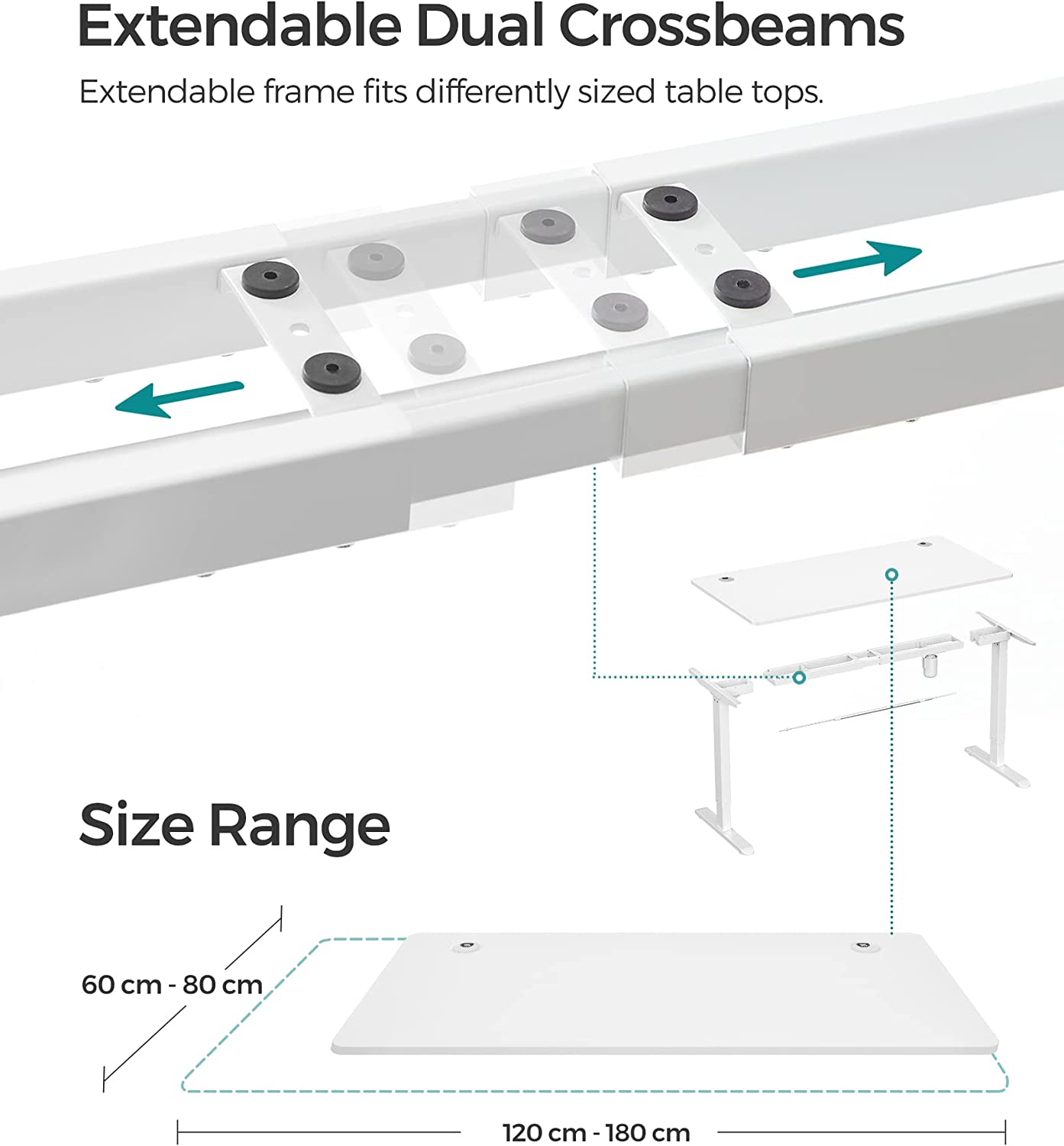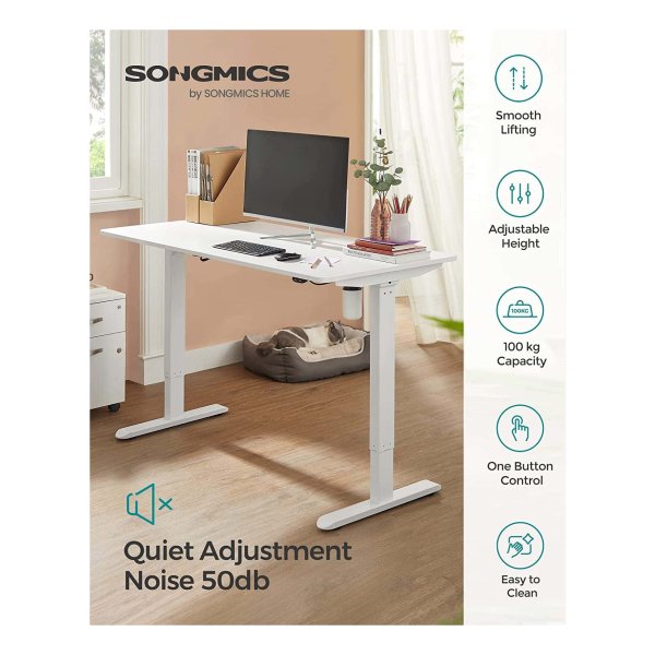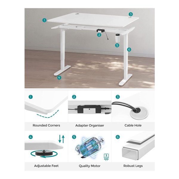 Kleur: Whitematerial: MDF (Fibreboard met middelgrote dichtheid), SteelDimensions: 140 x 70 x (73-114) cm (L x W x H) Hoogte-aanpassing: 73-114 cmvolume: <50 dbadjustment Snelheid: 25 mm/smax.Statisch laadvermogen: 100 kgweicht: 35 kg