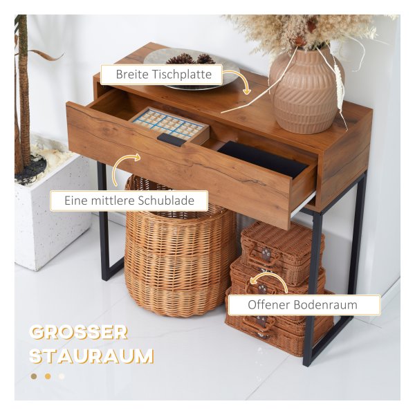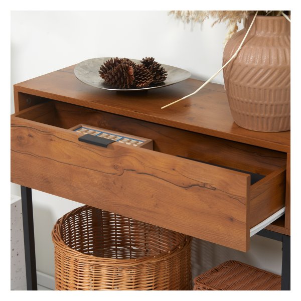 De dressoirtafel is voorzien van een lade en een ruim tafelblad, waardoor je voldoende opbergruimte hebt voor al je persoonlijke spullen en decoratieve items. Of je nu foto’s, vazen of andere snuisterijen wilt tentoonstellen, deze tafel biedt de perfecte plek om ze allemaal neer te zetten.