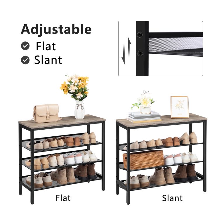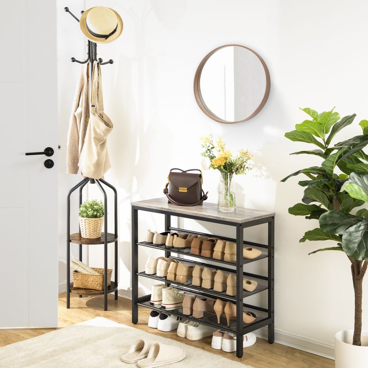 Industrieel schoenenrek, 4-laags schoenenplank, opslagorganisator-eenheid met 3 mesh planken, houten uiterlijk accentmeubilair met metalen frame, voor ingang, woonkamer, gang, greige