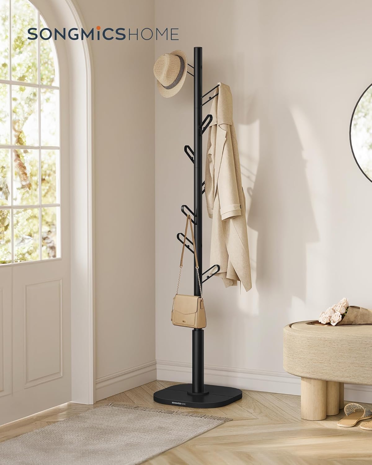 Stylish ink black freestanding coat rack made of steel and MDF, with 16 hooks for garments and accessories. Supports up to 40kg in total, easy to assemble..