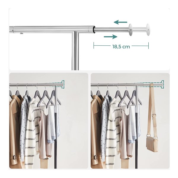 Kortom, deze kapstok is een stevige, duurzame en stijlvolle oplossing voor het opbergen van kleding. Hij is belastbaar tot 25 kg, verstelbaar en verkrijgbaar in een zilver-zwarte kleur.