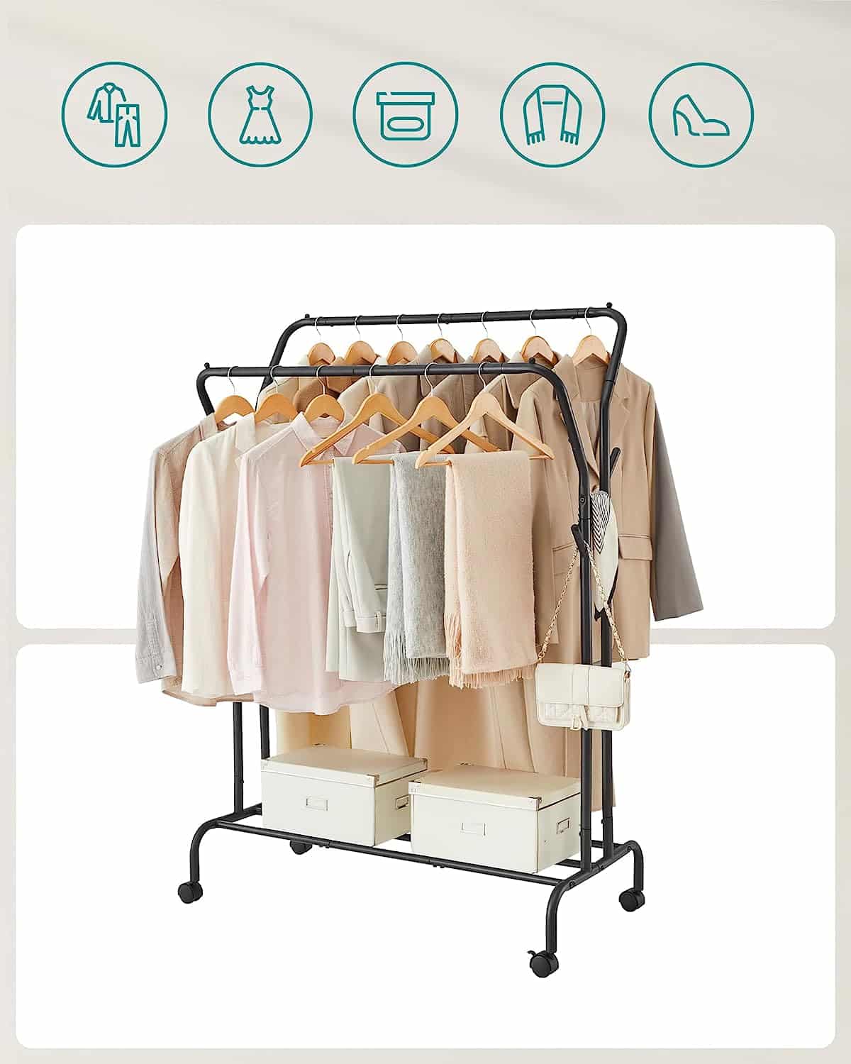 - Veelzijdig kledingrek: een hoge en een lage stang om kledingstukken van verschillende lengtes op te hangen; haken aan beide zijden om tassen, hoeden en andere accessoires op te hangen; extra plank om dozen, schoenen enz. op te bergen