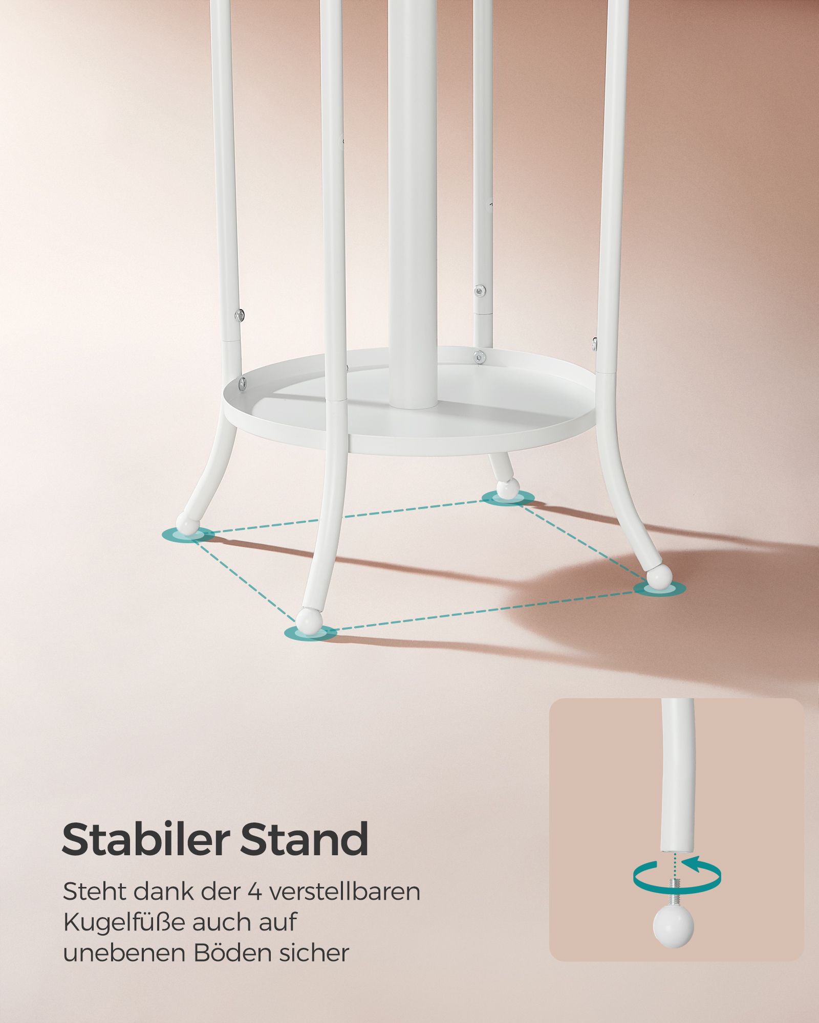 De 12 ball-vormige haken zijn niet alleen functioneel, maar ook beschermend. Ze voorkomen schade aan je kleding en zorgen ervoor dat ze stevig blijven hangen. Bovendien bieden de 4 verstelbare voeten extra stabiliteit, zelfs op vloeren die niet helemaal vlak zijn.