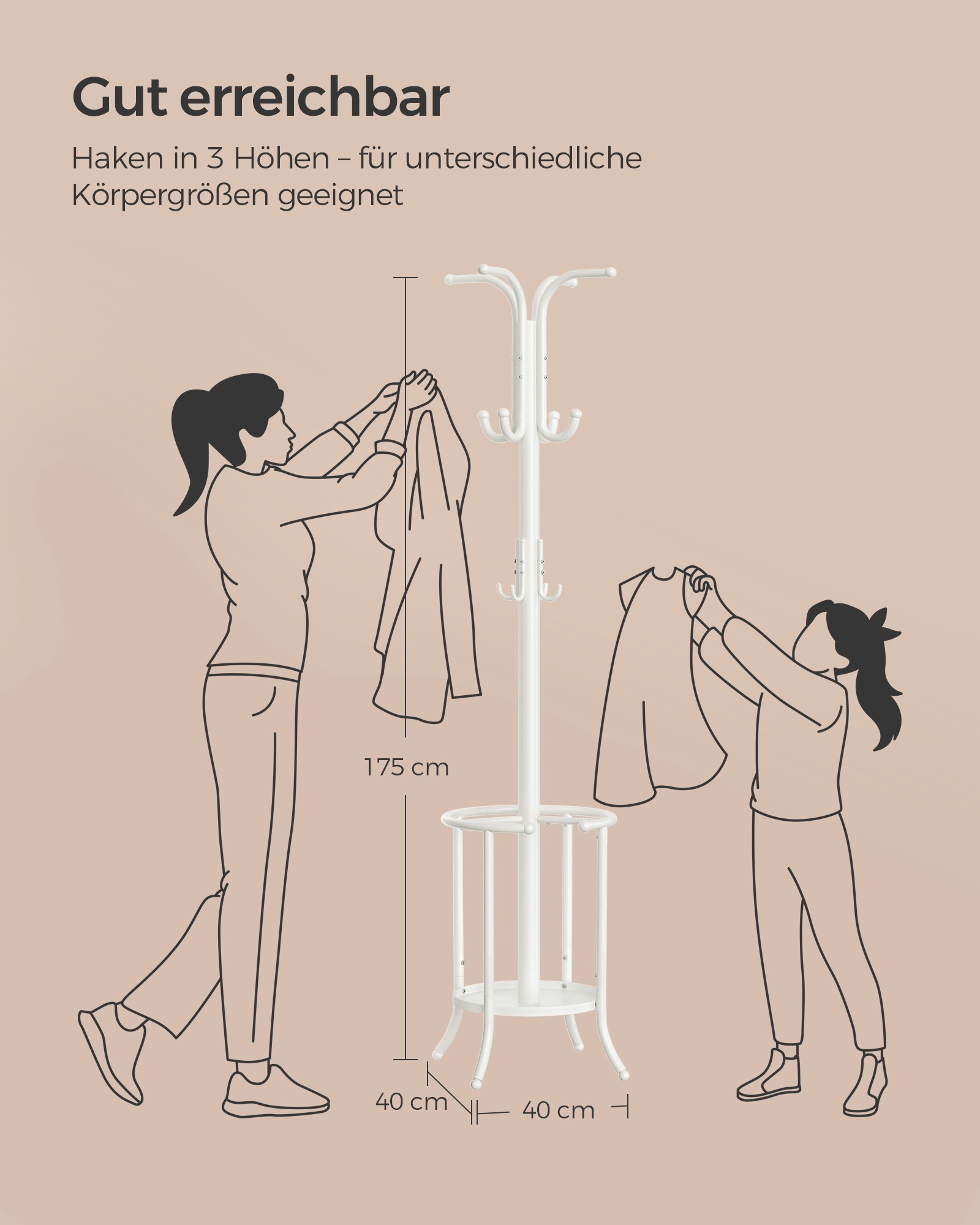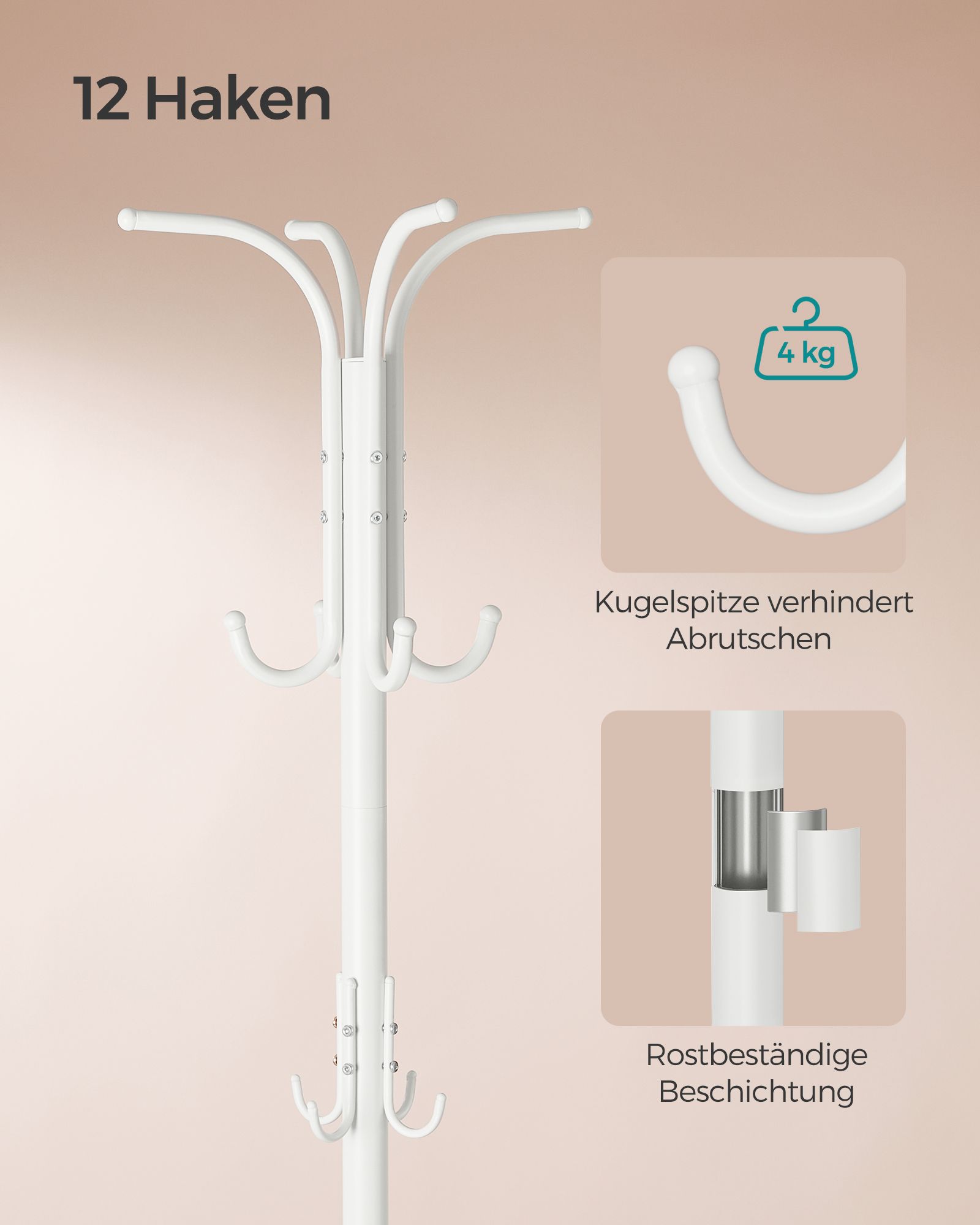 Met deze kapstok kun je met vertrouwen je jassen en tassen ophangen, dankzij de stevige constructie met 4 poten en een lage, stabiele zwaartepunt. Dankzij de 12 robuuste haken blijven je items veilig op hun plaats hangen, zonder risico op vallen of verschuiven.