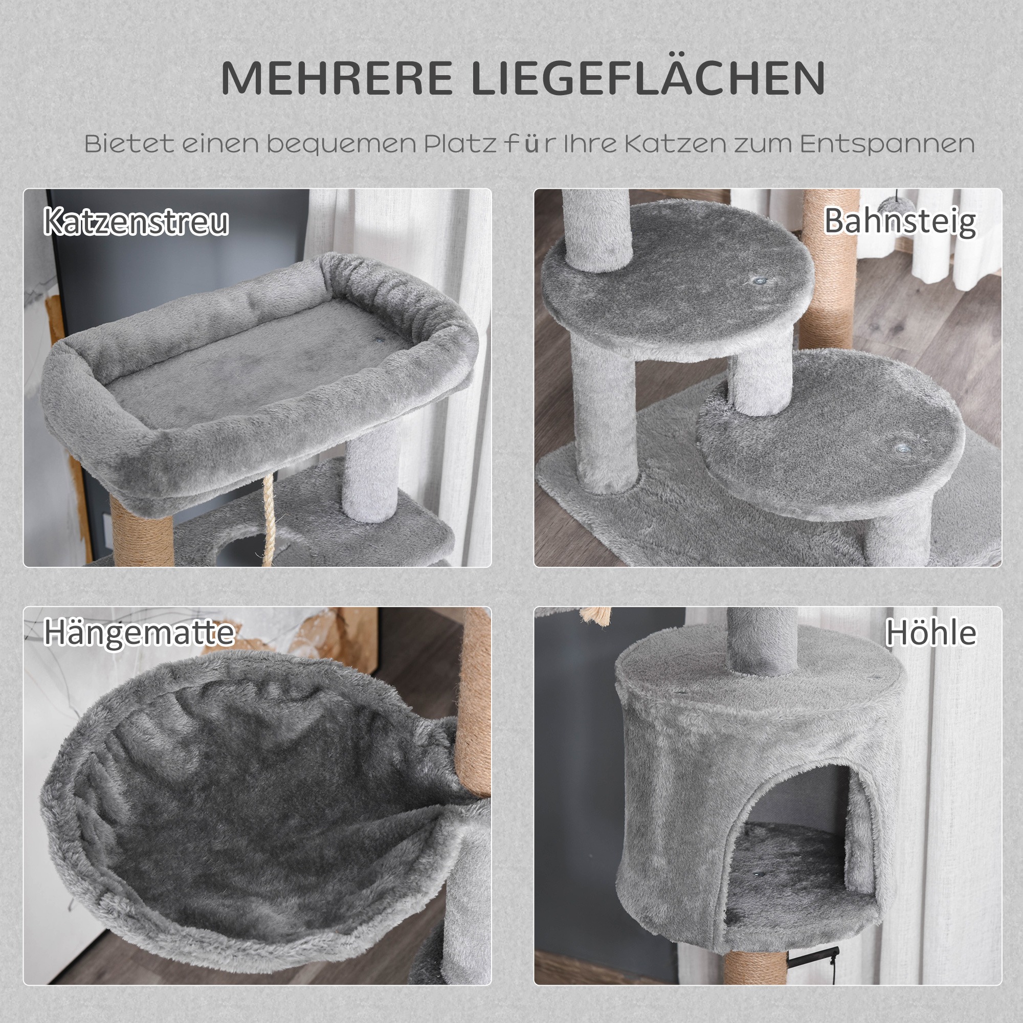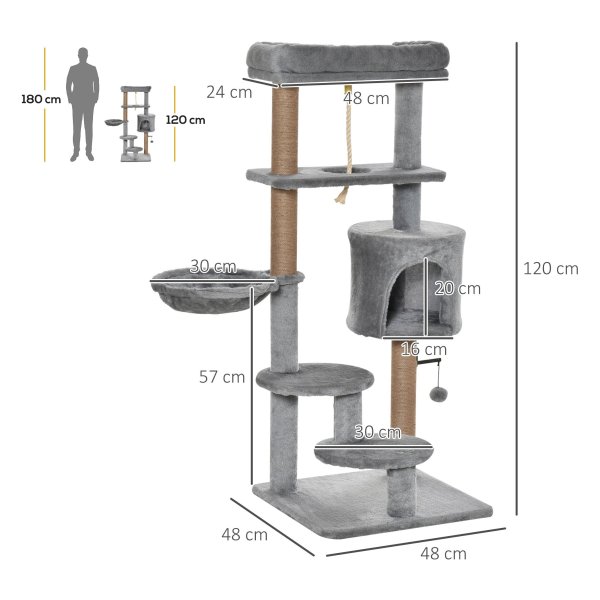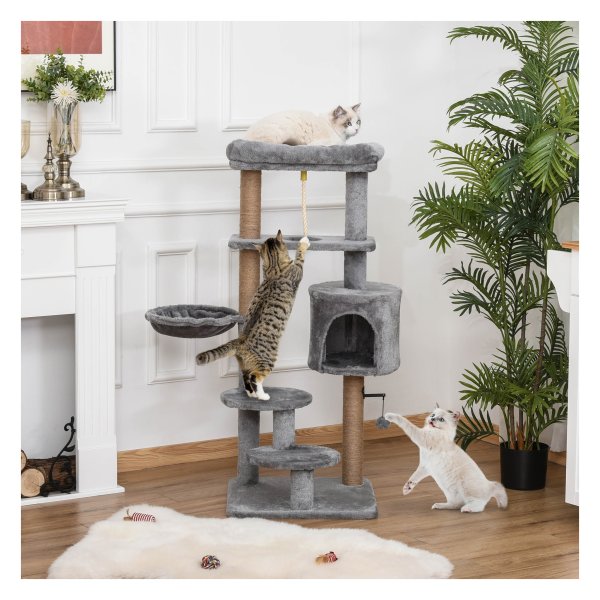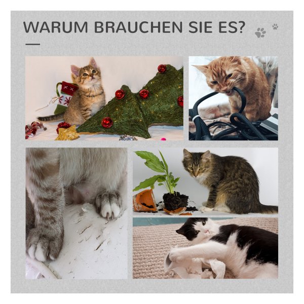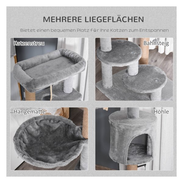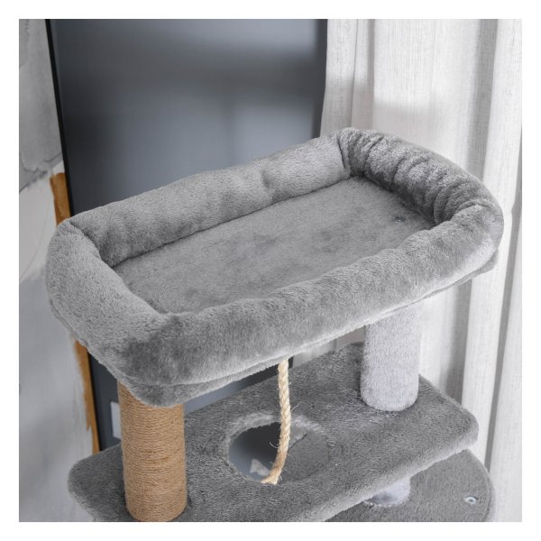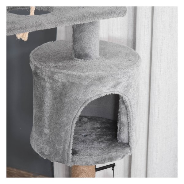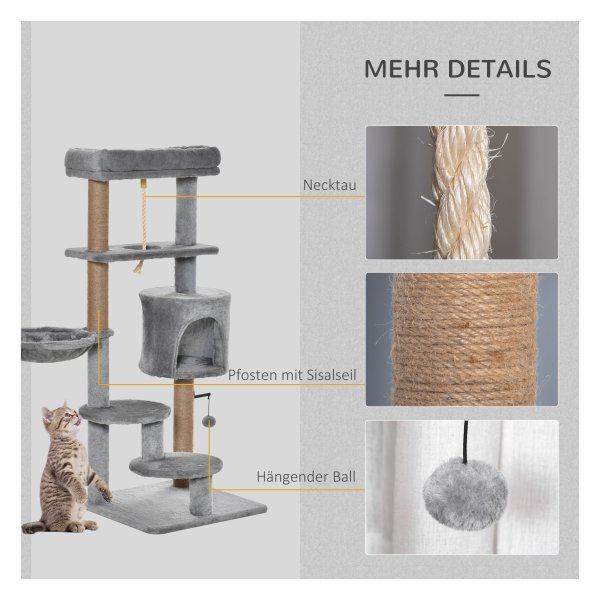De kattenpaal is bedekt met zacht en knus pluche, terwijl het samengestelde houten frame zorgt voor stabiliteit en duurzaamheid. Ook voorzie sisal krabpalen om ervoor te zorgen dat jouw kat zijn klauwen kan slijpen en je meubels beschermt blijven.