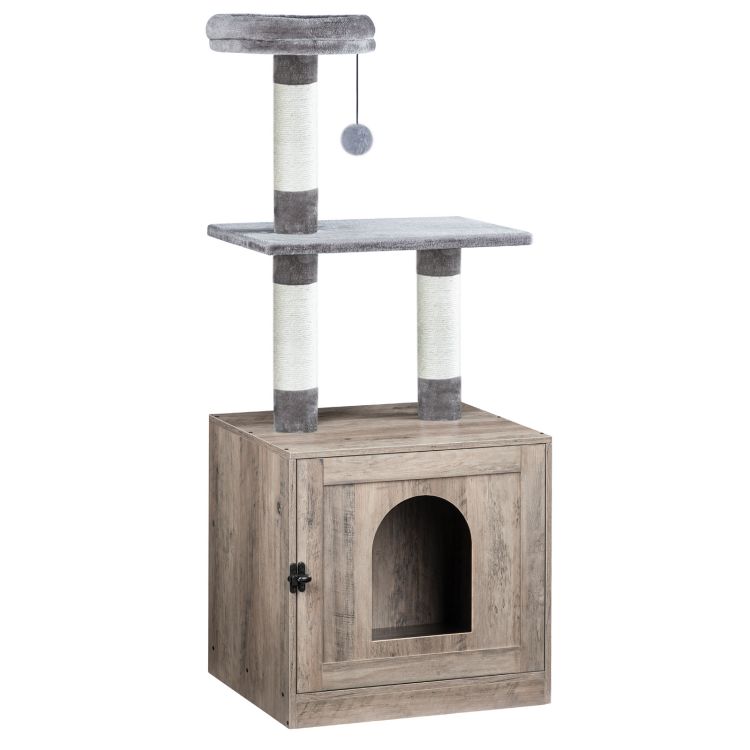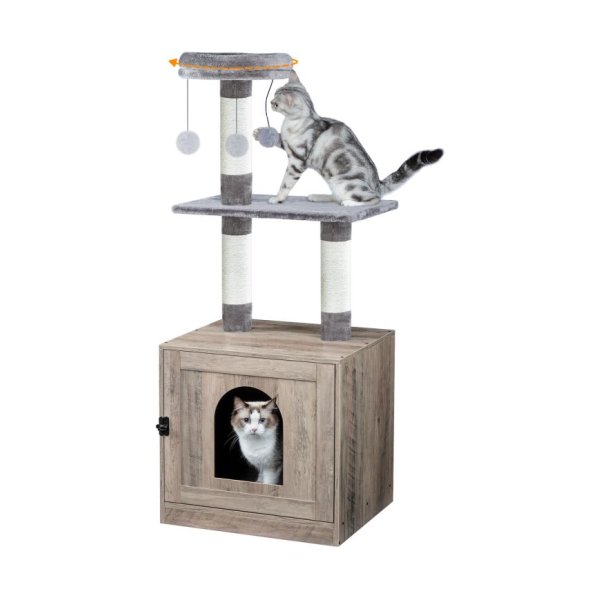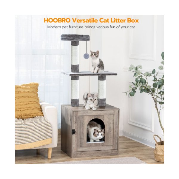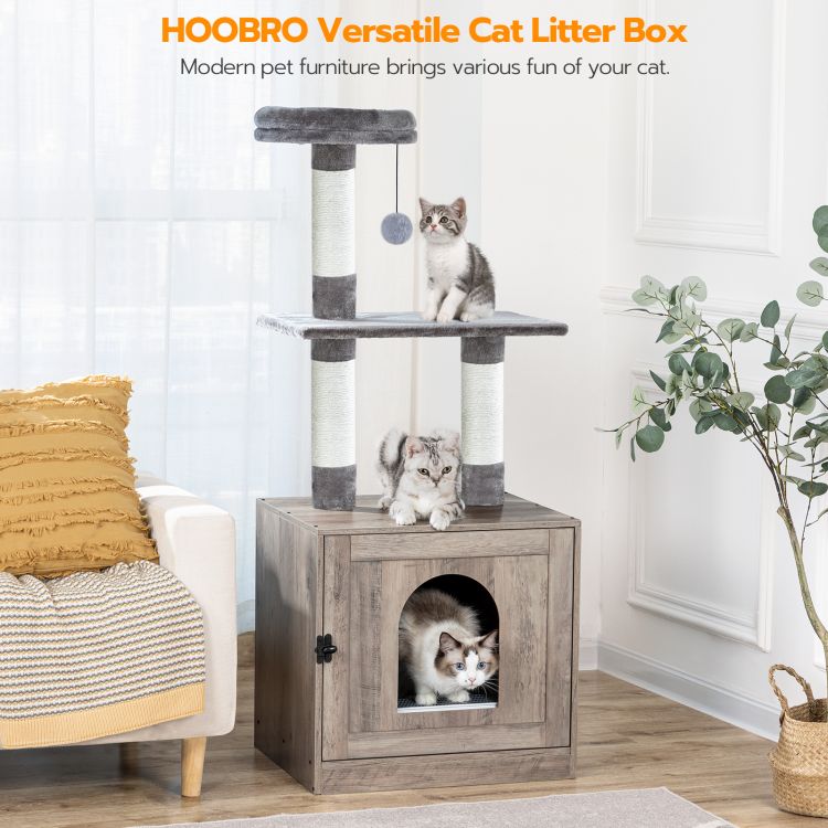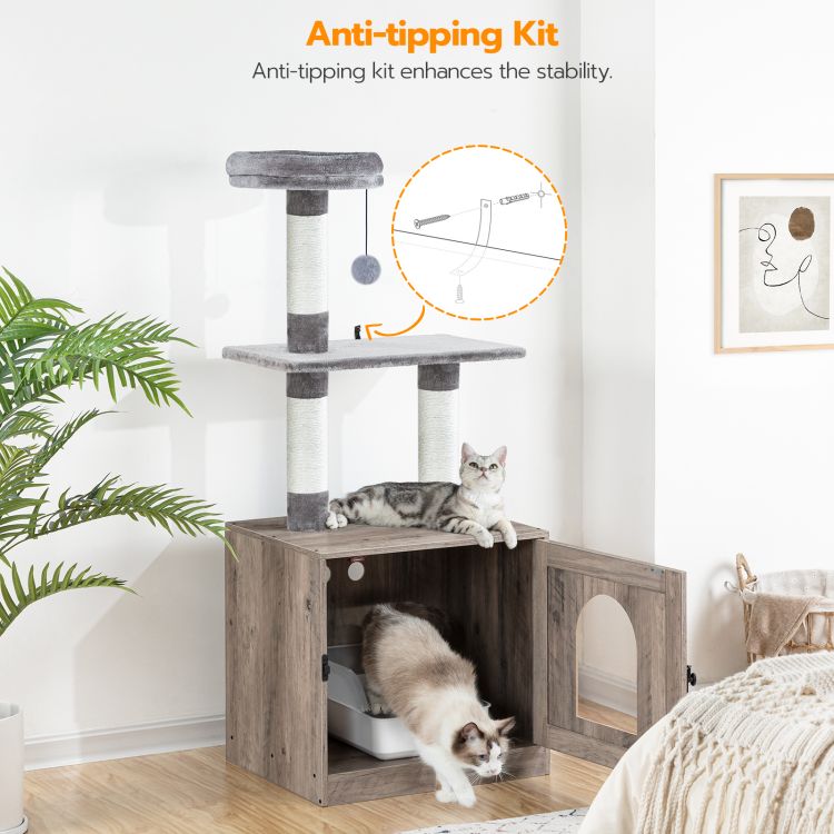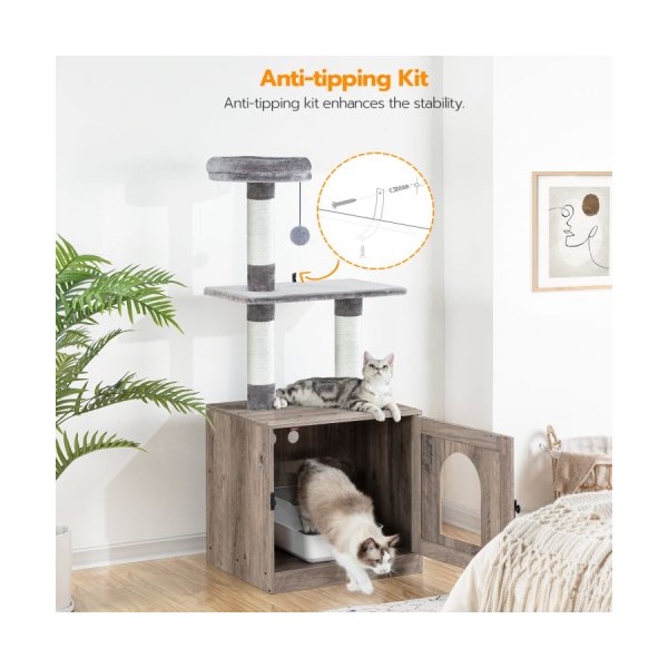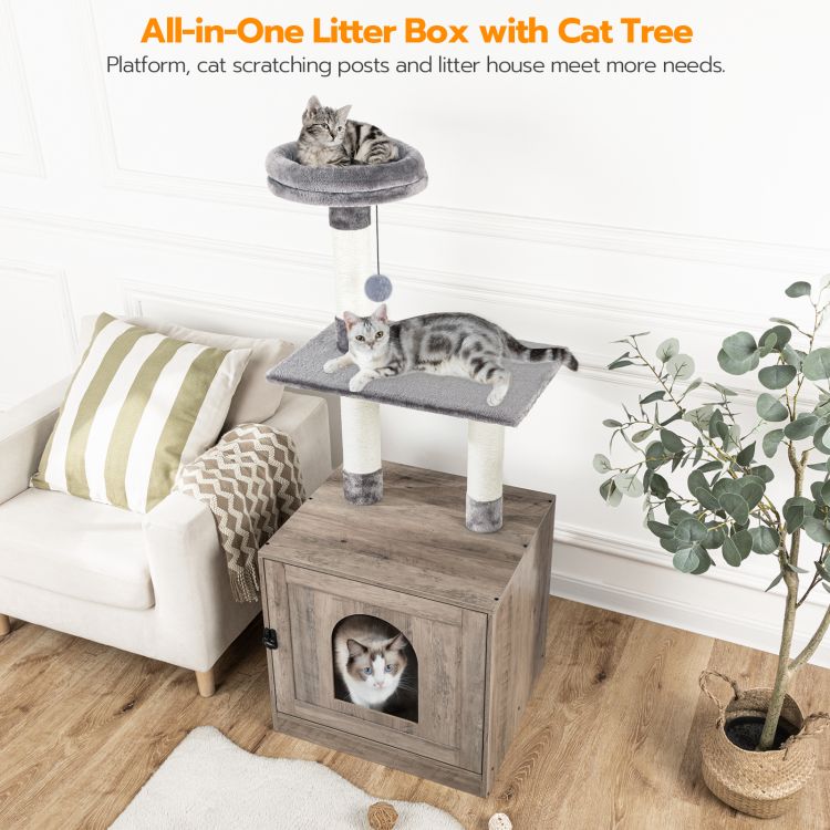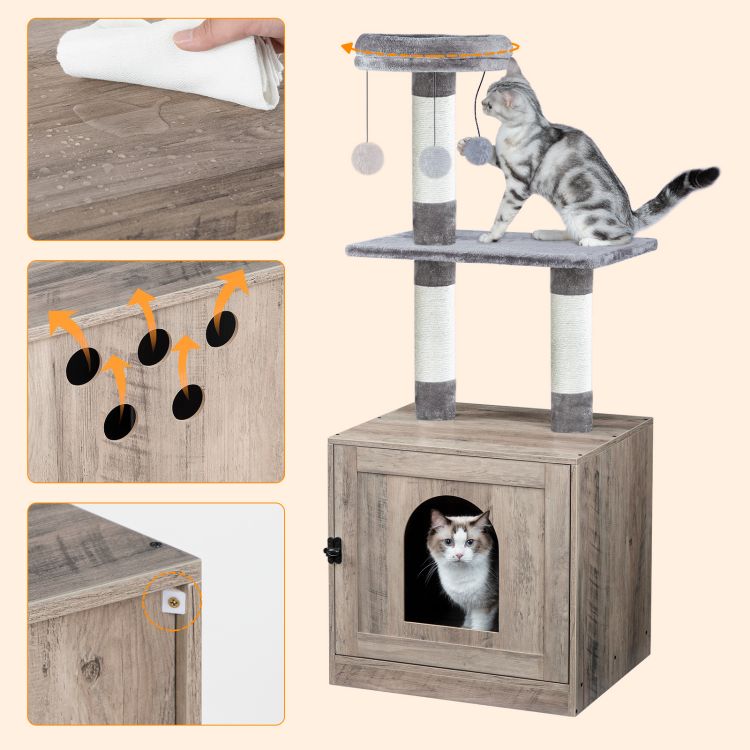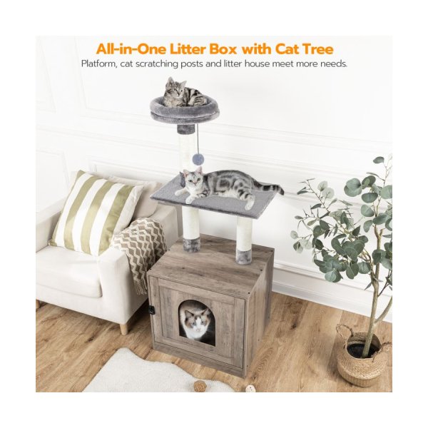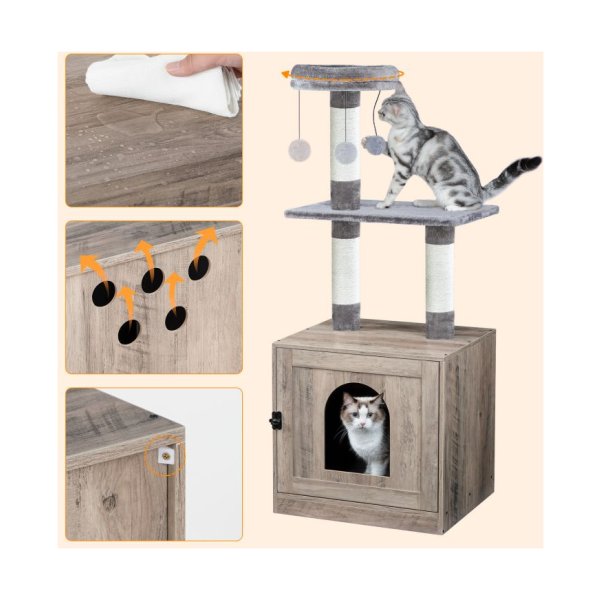 Kattenbak behuizing met kattenboomtoren, verborgen katten wasruimte met krabpaal en zachte pluche baars, houten kattenmeubels, binnenvinkkast met meerdere platforms, greige