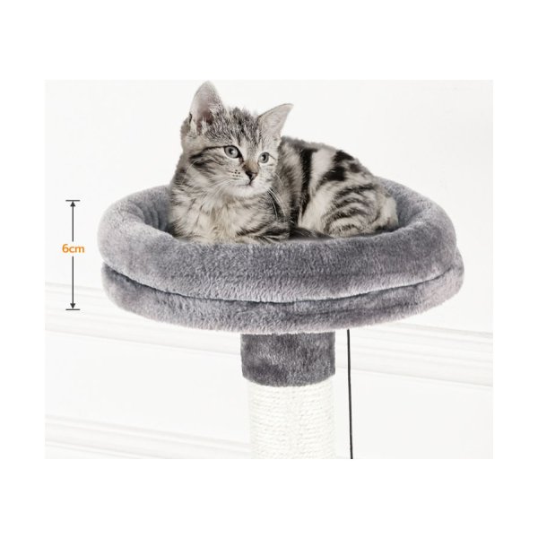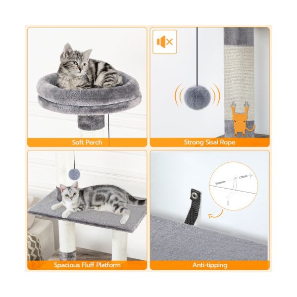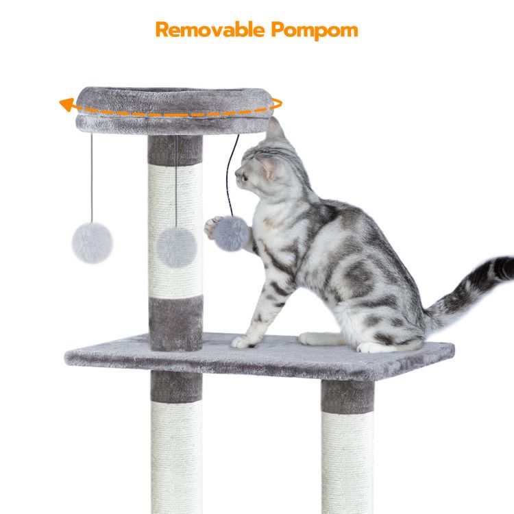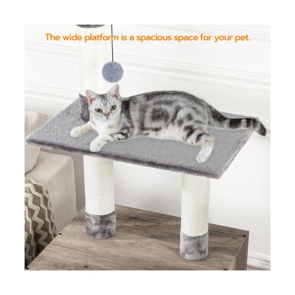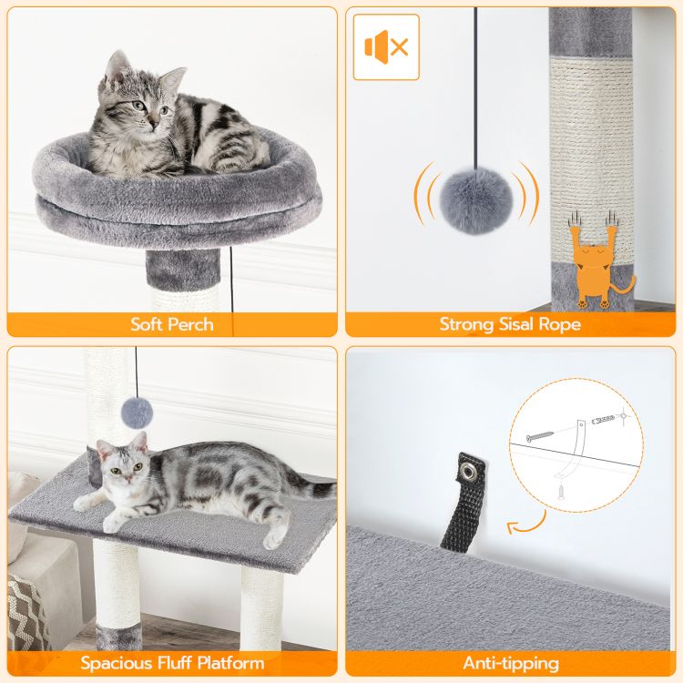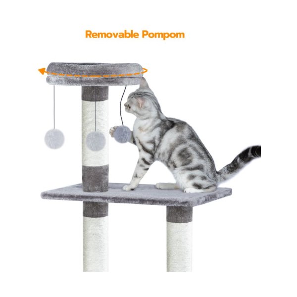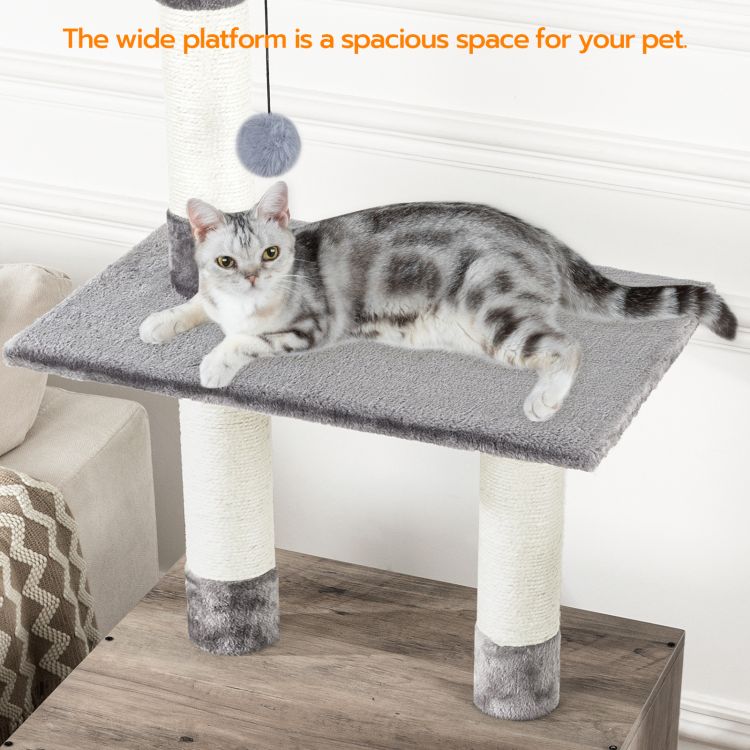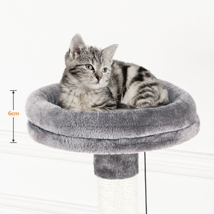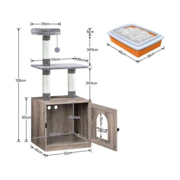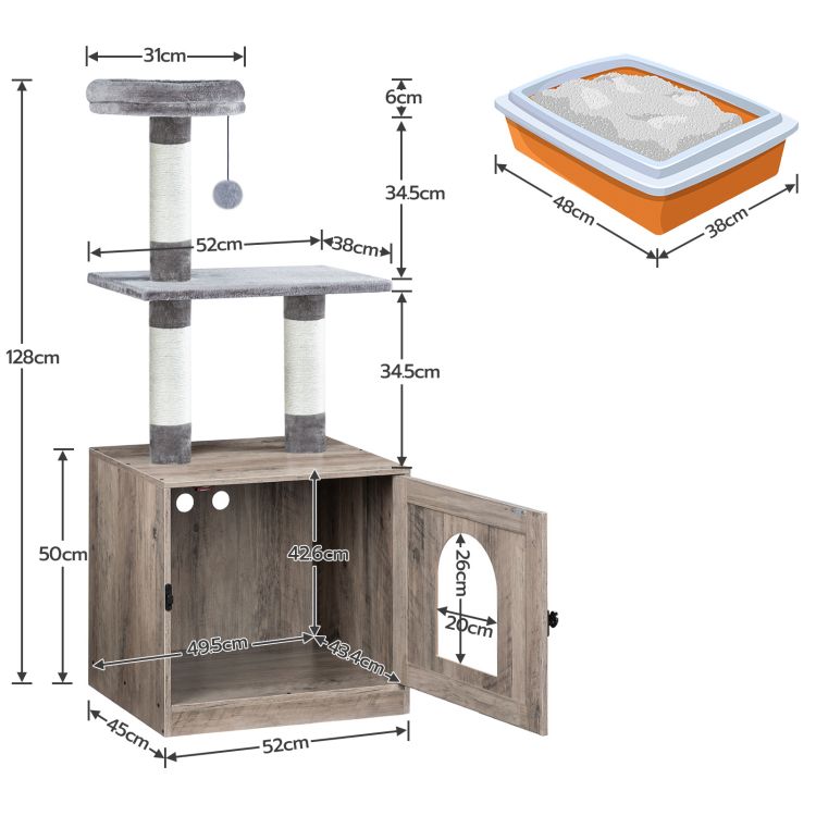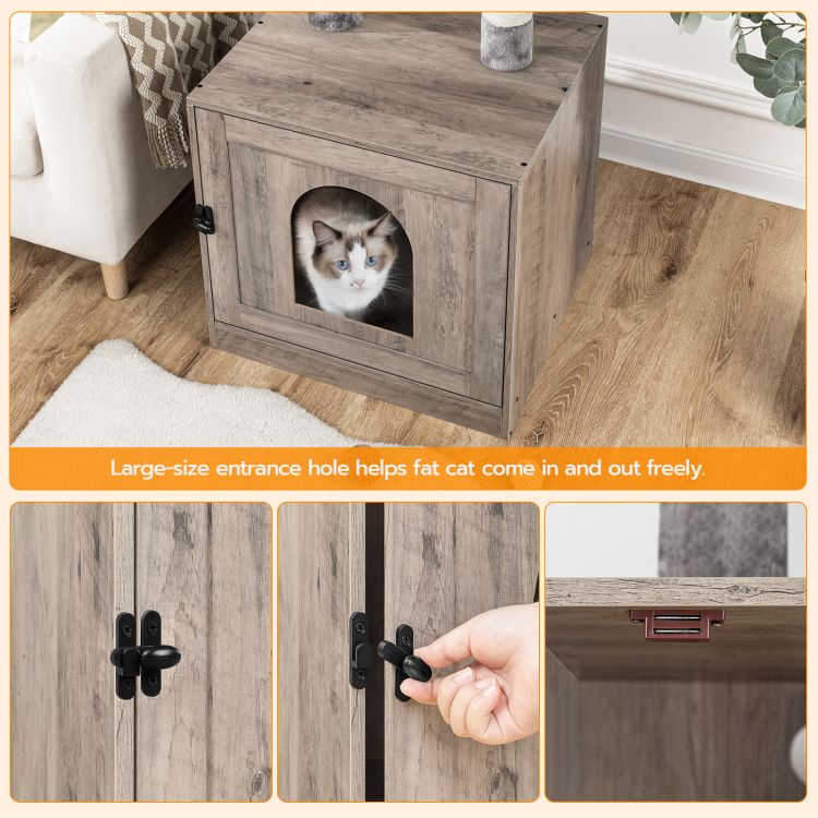 Kattenbak behuizing met kattenboomtoren, verborgen katten wasruimte met krabpaal en zachte pluche baars, houten kattenmeubels, binnenvinkkast met meerdere platforms, greige