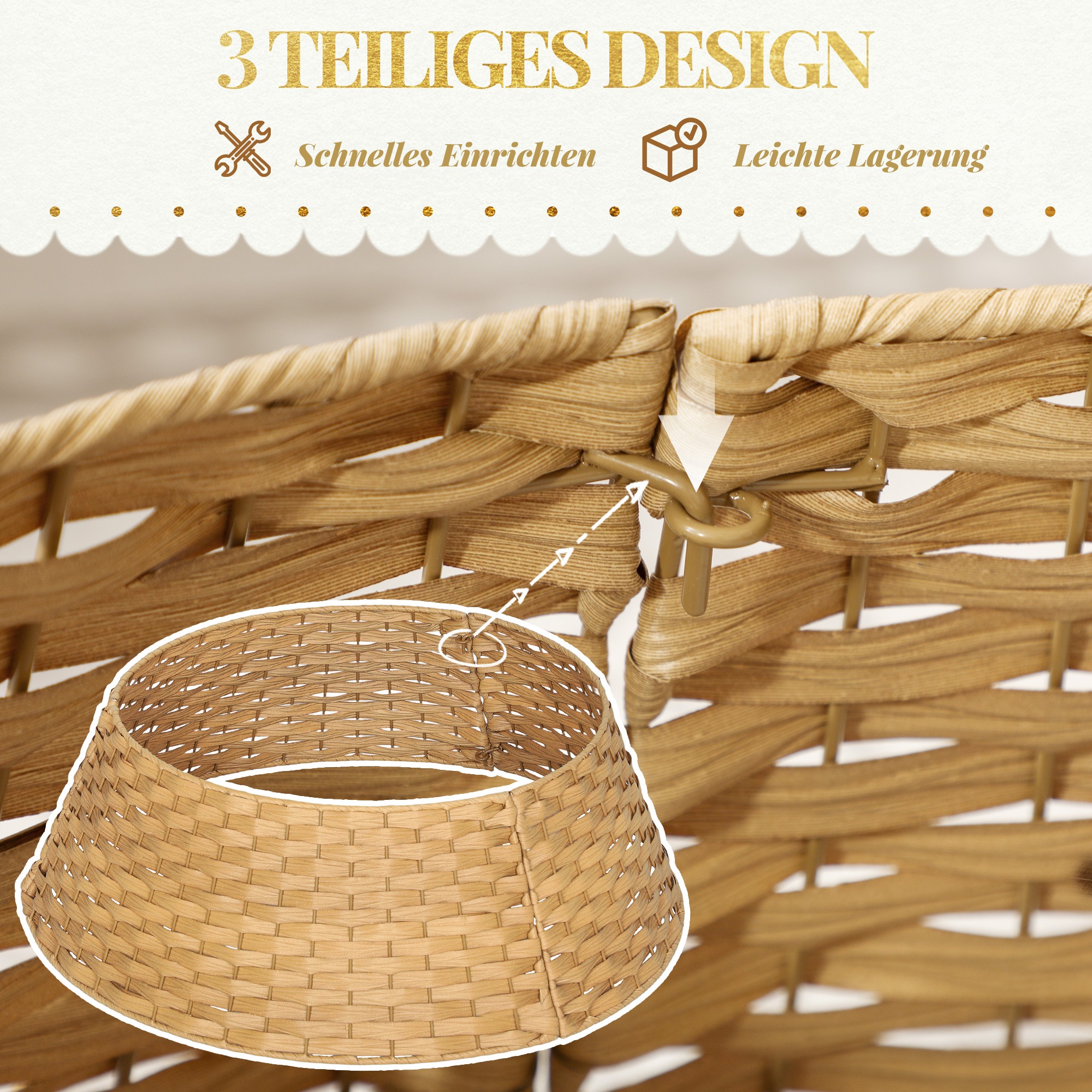 De handgeweven kerstboomrok in natuurlijke kleur combineert rustieke charme met modern design. Gemaakt van duurzaam kunststof en metaal biedt het een stabiele basis voor bomen tot 270 cm hoog. Beschermt de boomstandaard en is eenvoudig te monteren.