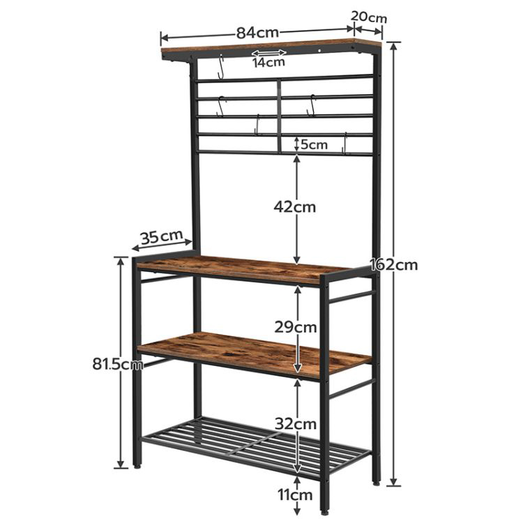 Keukenbakker’s rek, keuken magnetron ovenstandaard met 6 s-haken, keukenplank met hoge display plank, koffiestation, rustiek bruin