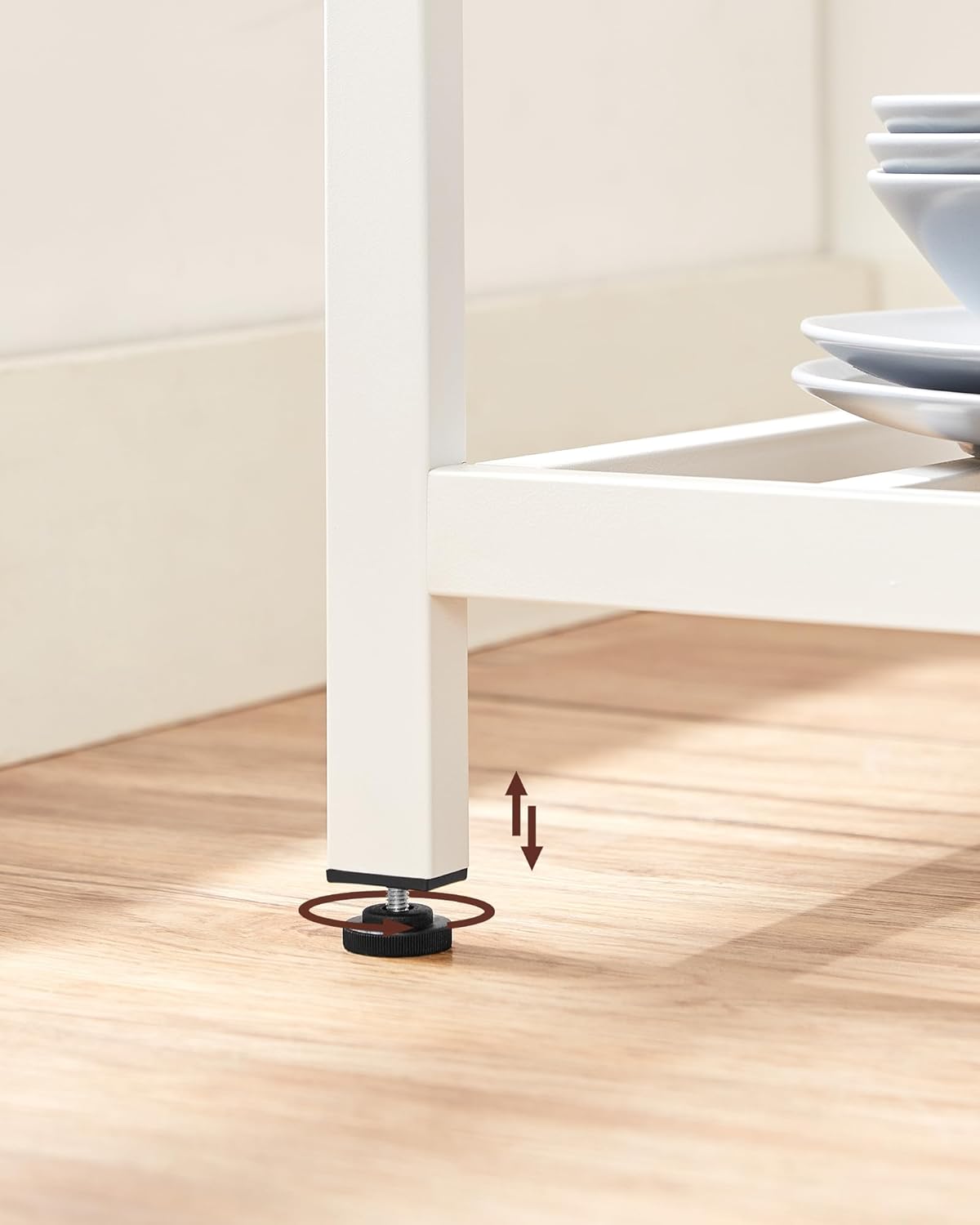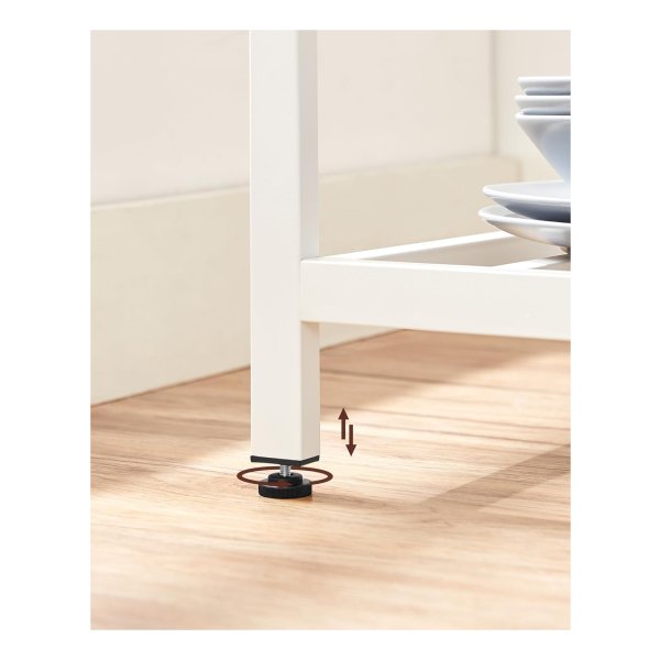 Bullet Point 4 | Niet meer wiebelen – de verstelbare benen die aan de 4 poten zijn bevestigd, zorgen ervoor dat dit rek stabiel staat en niet wiebelt bij elke objectset, zelfs op enigszins ongelijke vloeren |