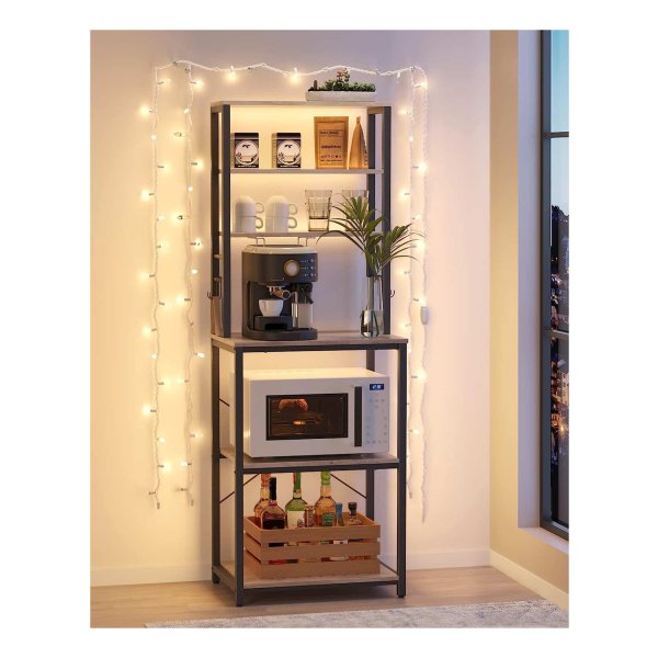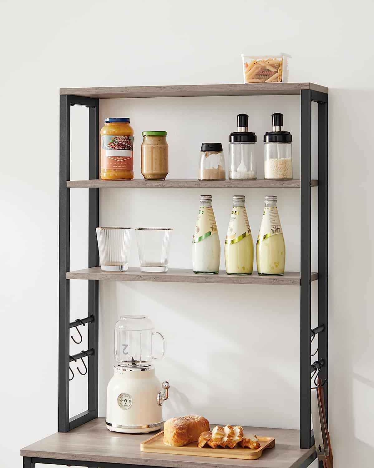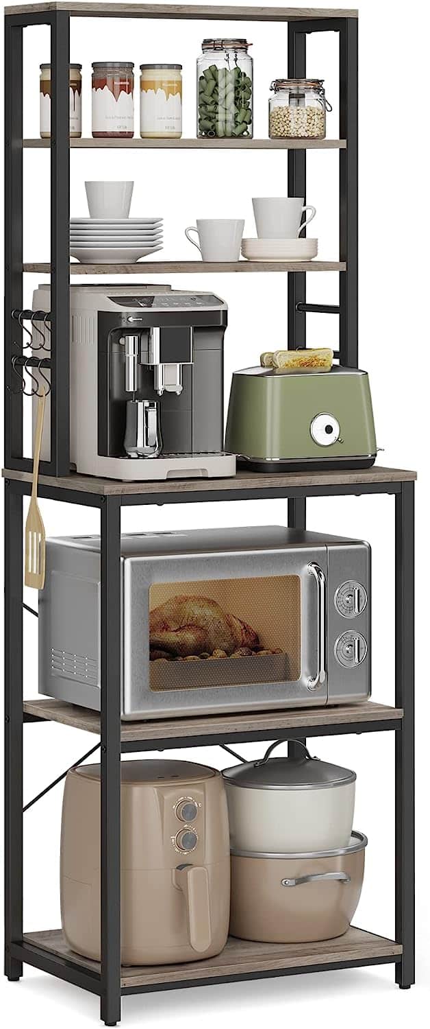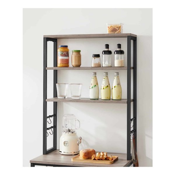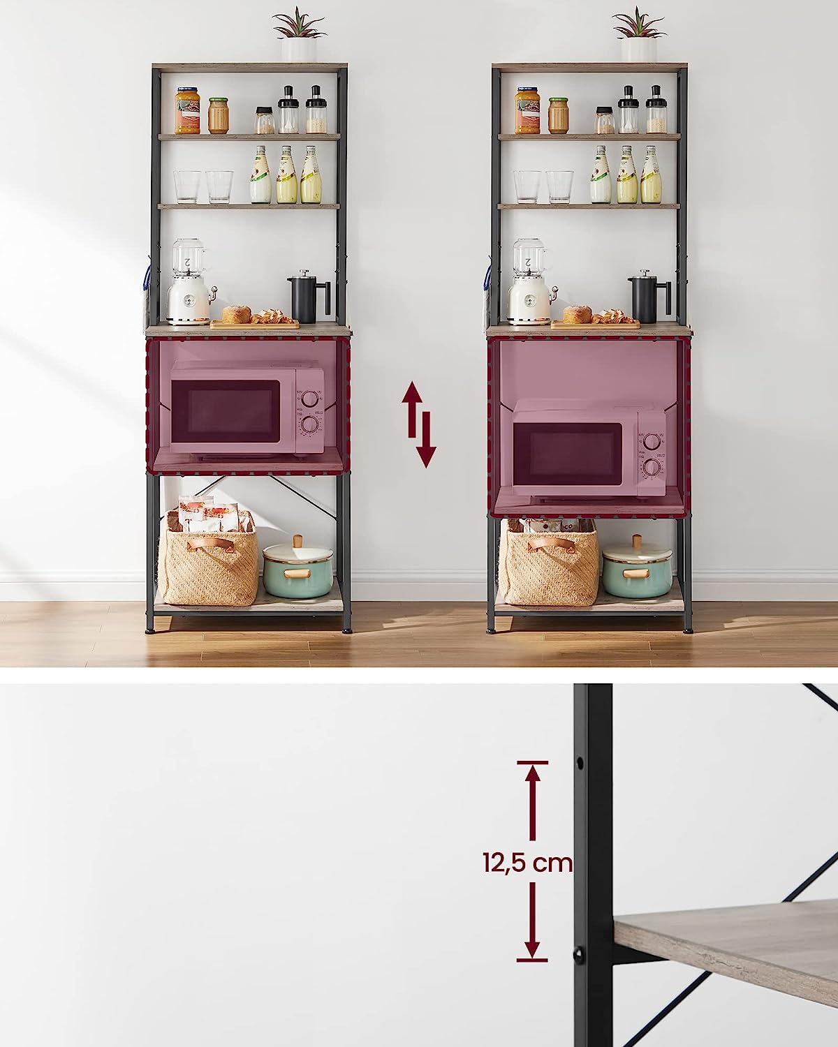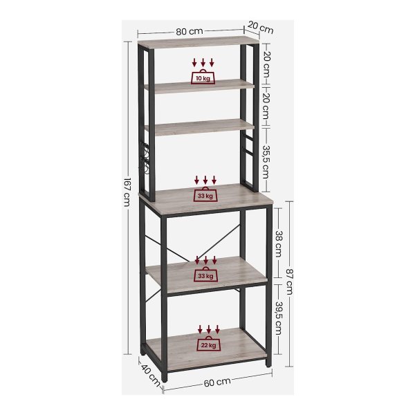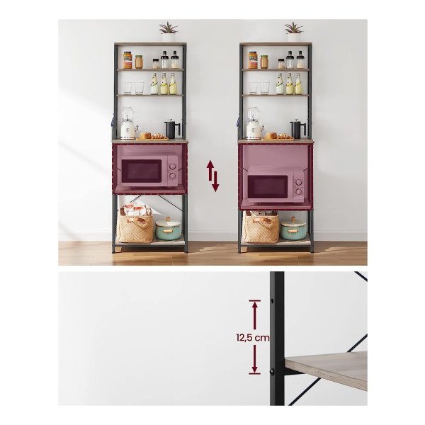 Dit keukenrek is een perfecte oplossing voor het organiseren van uw keuken. Het heeft een stevig stalen frame en een industriële stijl die perfect past bij elke keuken. Het heeft 6 planken en 6 haken, waardoor u al uw kookgerei en koffiezetapparaten gemakkelijk kunt opbergen. Het rek is 40 x 60 x 167 cm groot en heeft een grijs en zwarte kleur. Het is perfect voor het opbergen van uw magnetron en andere kleine keukenapparaten. Het is gemaakt van stevig staal en is sterk genoeg om al uw keukengerei te dragen. Het is een perfecte oplossing voor het organiseren van uw keuken en het zal uw keuken een stijlvolle en moderne uitstraling geven. Productdetails: