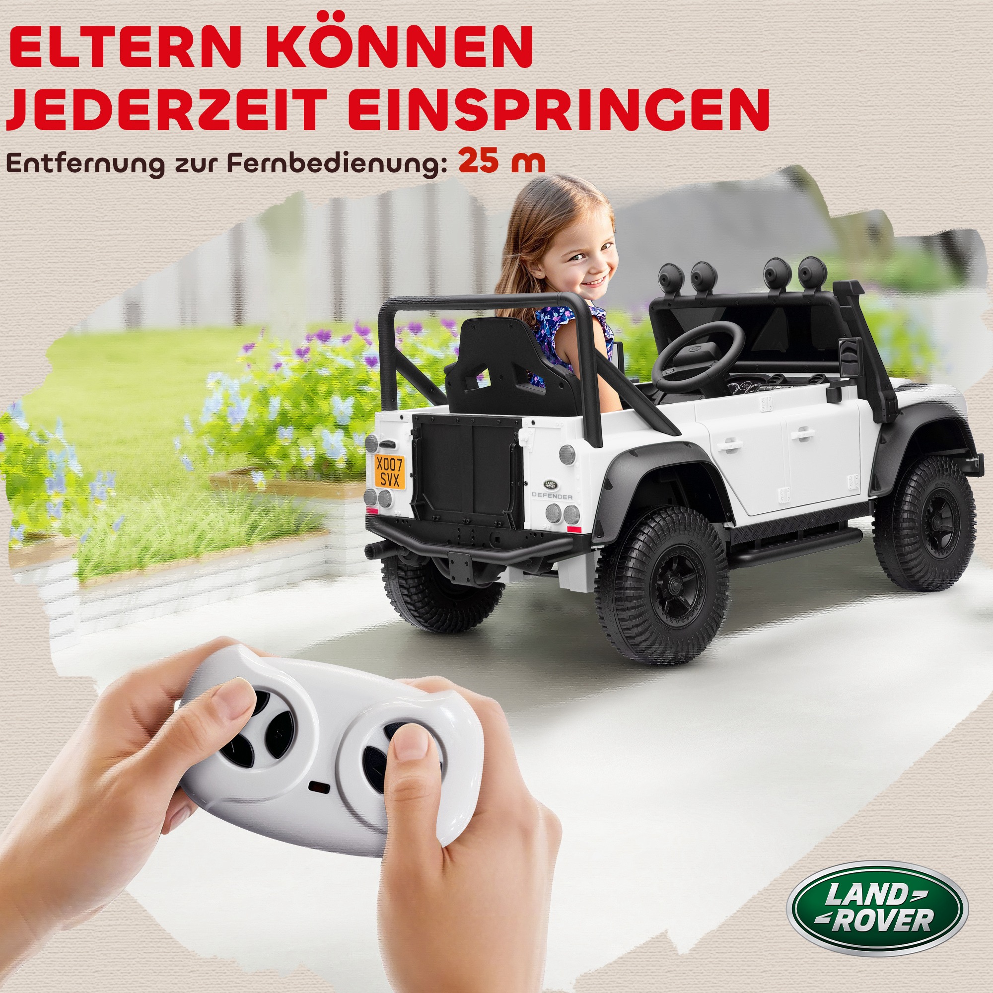 Deze officieel gelicentieerde Land Rover kinderauto is ontworpen voor urenlang speelplezier voor uw kinderen. Met zijn opvallende witte kleur, dubbele deuren, toeter, LED-koplampen en muziekfuncties, zorgt deze elektrische auto voor een realistische rijervaring.