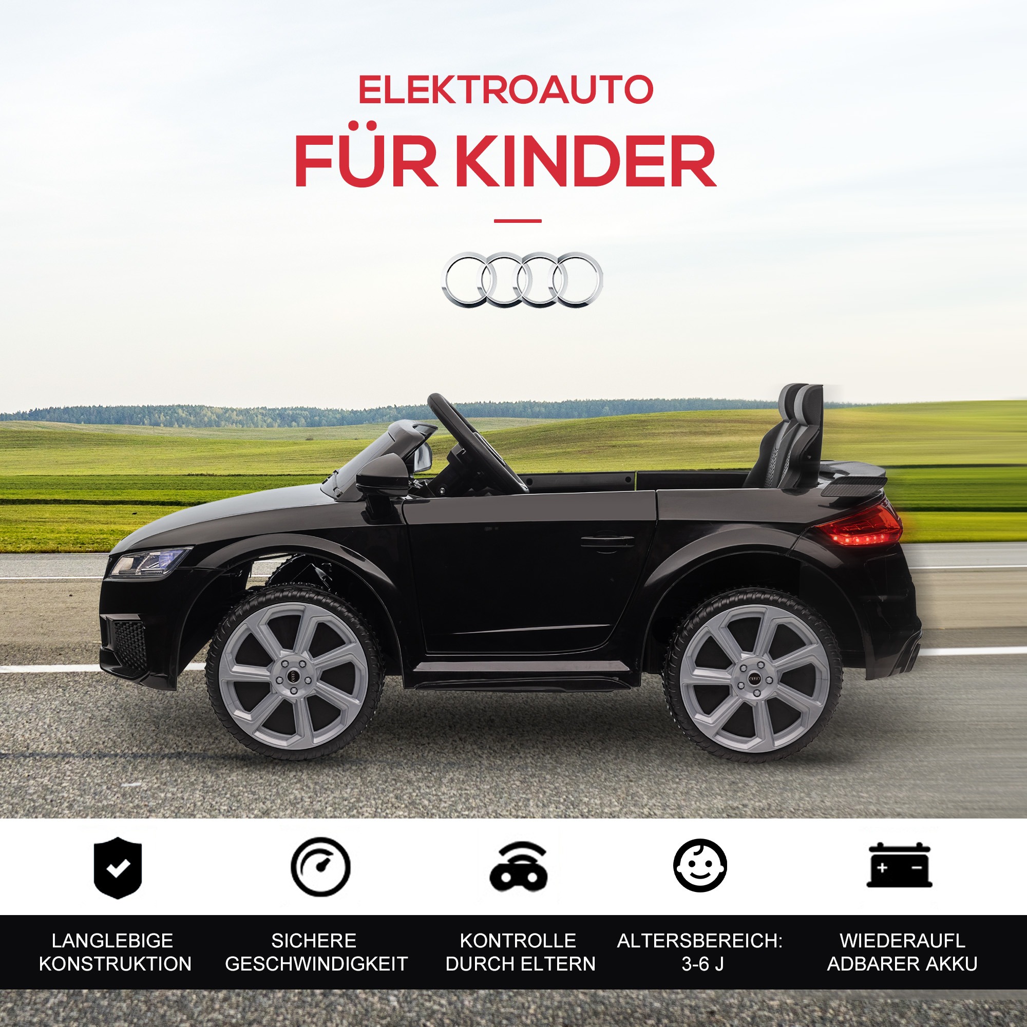 De kinderauto in Audi-stijl biedt veilig rijplezier met afstandsbediening en muziek. Met een echt uiterlijk en 45 minuten rijtijd is dit een ideaal cadeau voor kinderen van 3-5 jaar. Veilig, stoer en plezierig spelen gegarandeerd!.