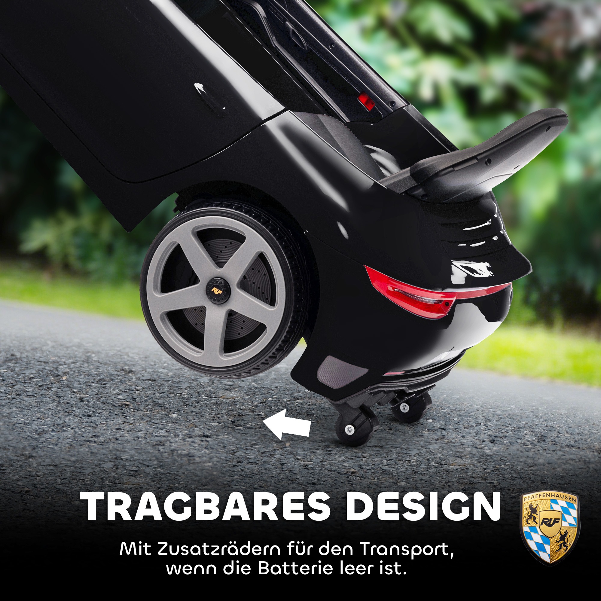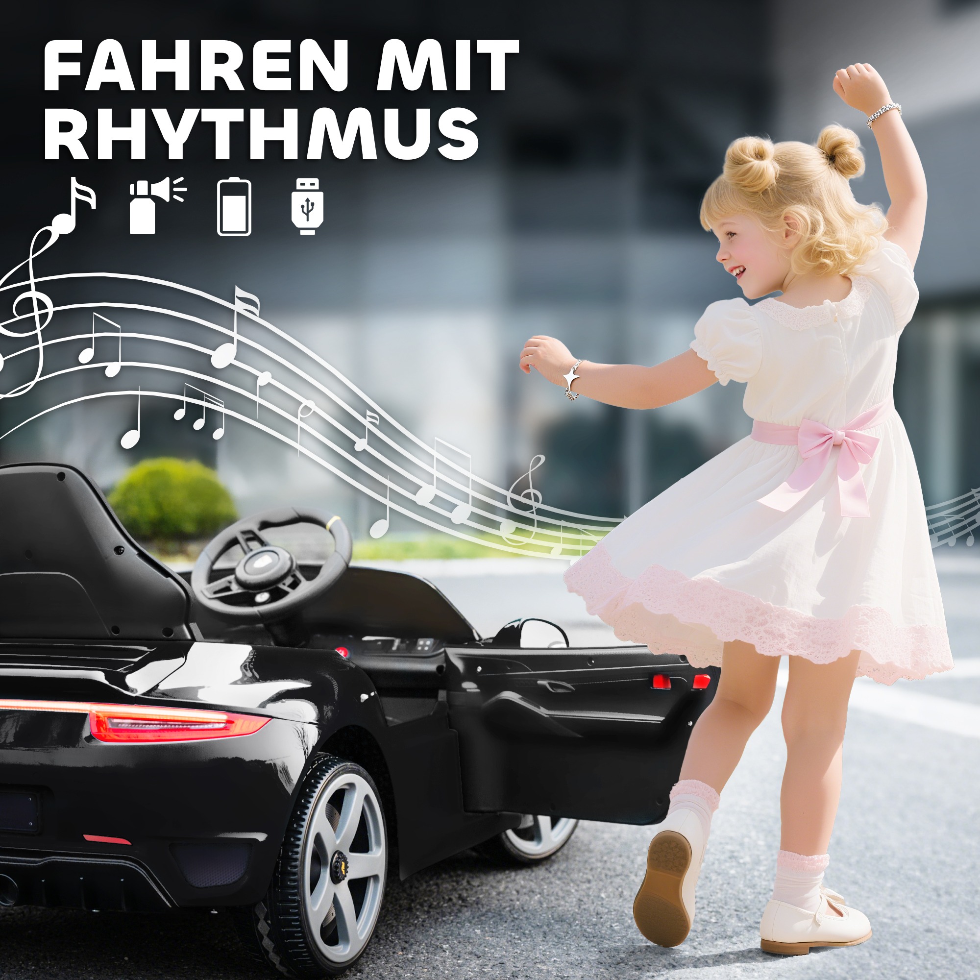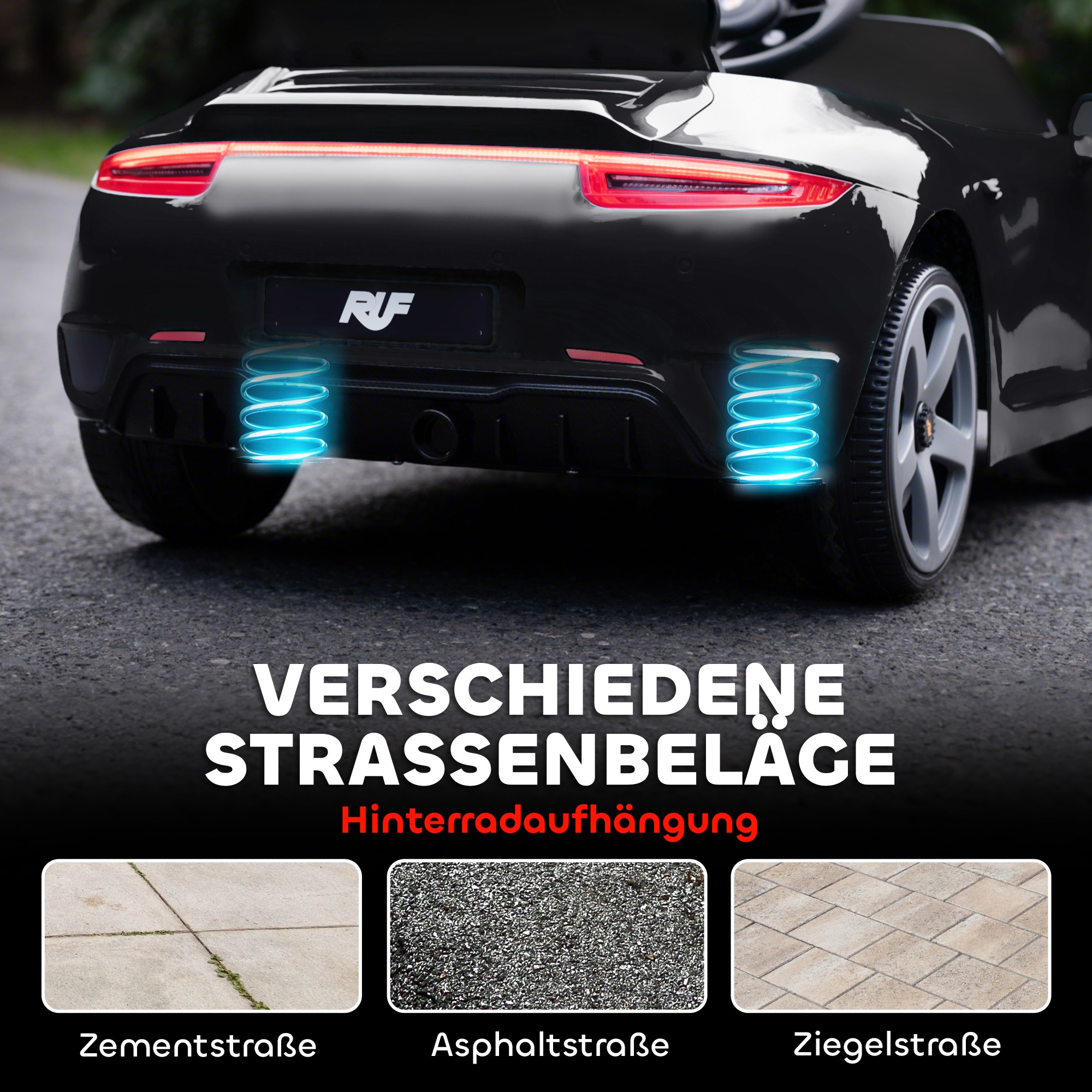 Kindermotor met RUF GT design, dubbele besturing, veiligheidsfuncties, muziek, USB, en afstandsbediening. Voor 3-5 jaar, zwart, 30 kg belasting..