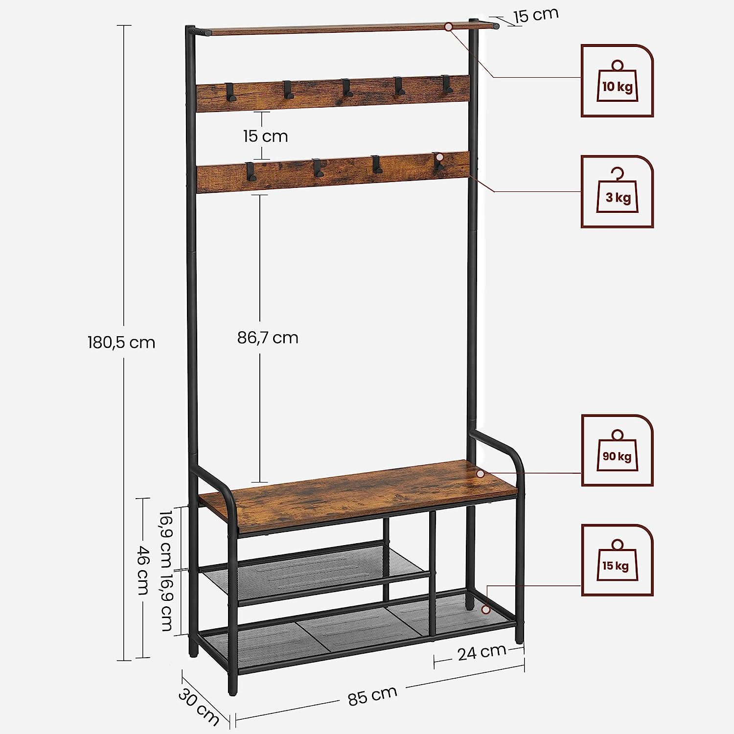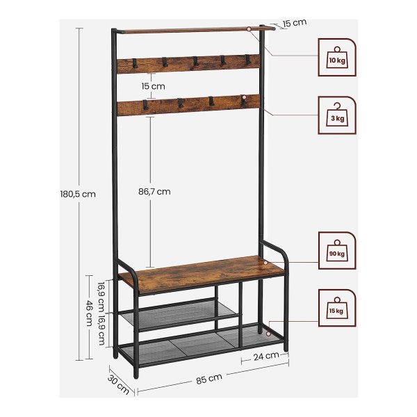 Dit kledingrek is een perfecte oplossing voor kleine woningen, zoals een hal of slaapkamer. Het heeft een industrieel design met een vintage bruin-zwarte kleur. Het kledingrek is 30 cm breed, 85 cm hoog en 180,5 cm diep. Het heeft 9 haken, een schoenenbank en een plank.