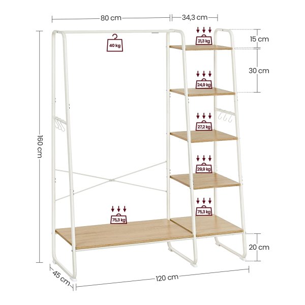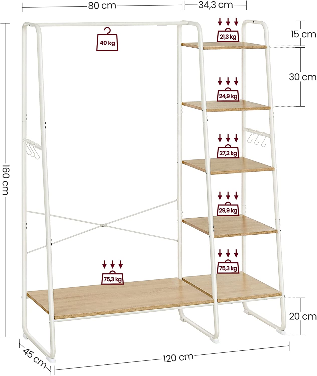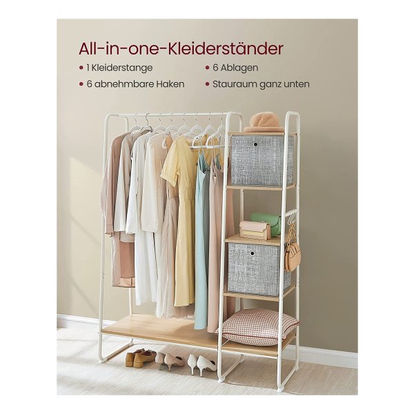 De Kledingopberger Deluxe is ontworpen om optimaal gebruik te maken van elke centimeter in je kamer. Hang je jassen, overhemden en jurken op aan de stevige kledingroede, terwijl je tassen, schoenen en accessoires netjes kunt opbergen op de verschillende planken. Met de afneembare haken aan de zijstangen heb je zelfs ruimte voor hoeden en sjaals. Zo heb je al je favoriete kledingstukken en accessoires binnen handbereik, waardoor je snel en gemakkelijk een outfit kunt samenstellen voor elke gelegenheid.