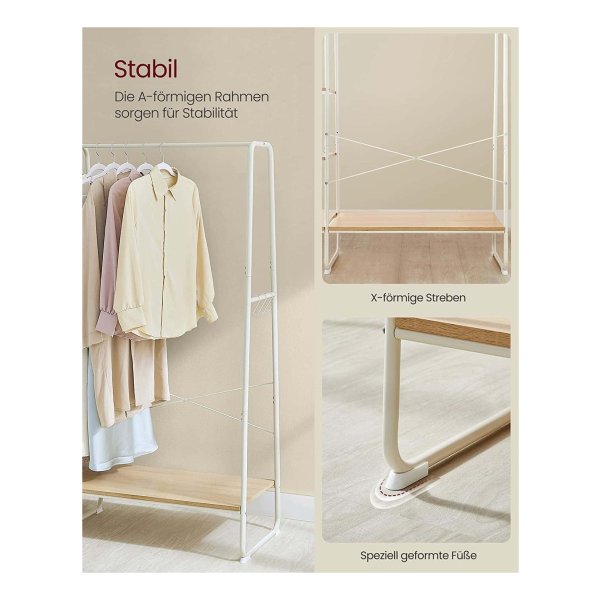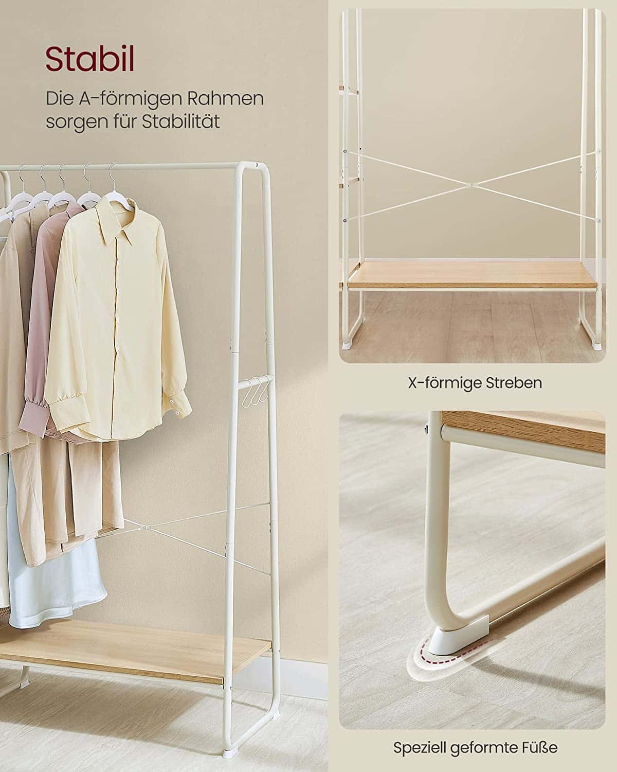De kledingopberger is gemaakt van hoogwaardige materialen, zoals spaanplaat en stalen buizen, waardoor het een robuuste en duurzame constructie heeft. Met een draagvermogen van maar liefst 220 kg, hoef je je geen zorgen te maken over het gewicht van al je kledingstukken. De A-vormige structuur, X-stutten aan de achterkant en antislipvoetjes zorgen voor maximale stabiliteit en beschermen je vloer tegen krassen.