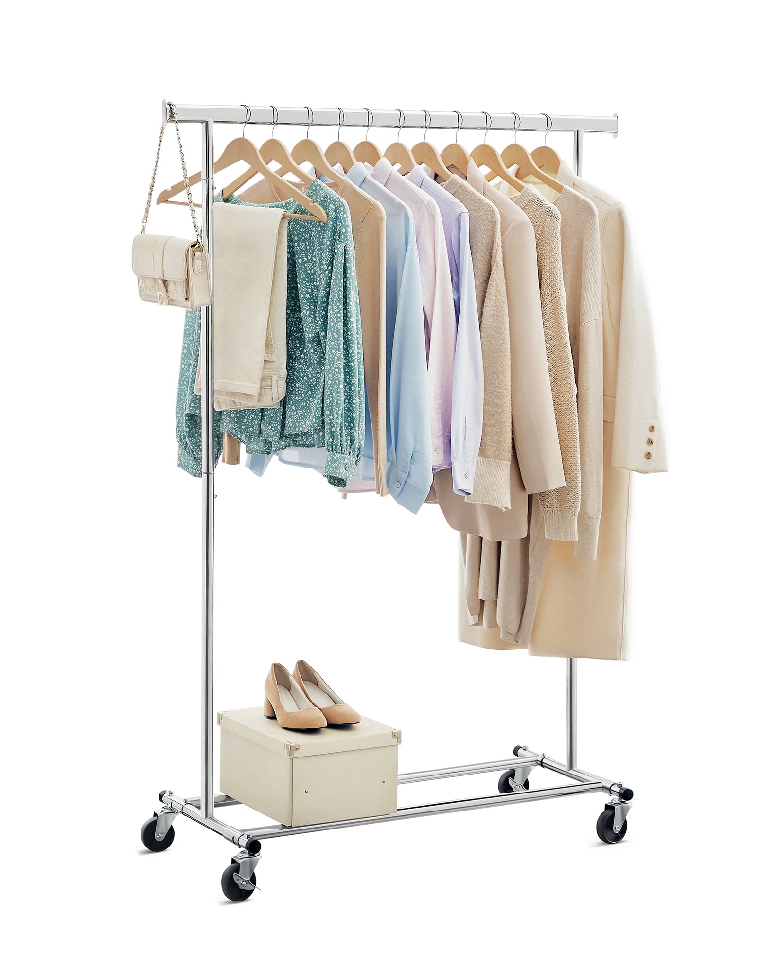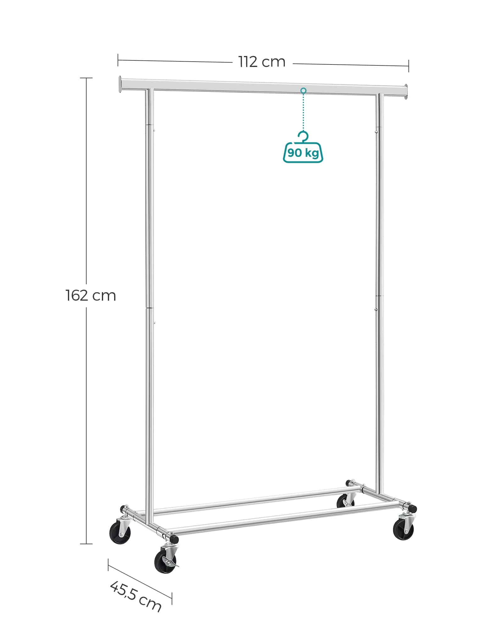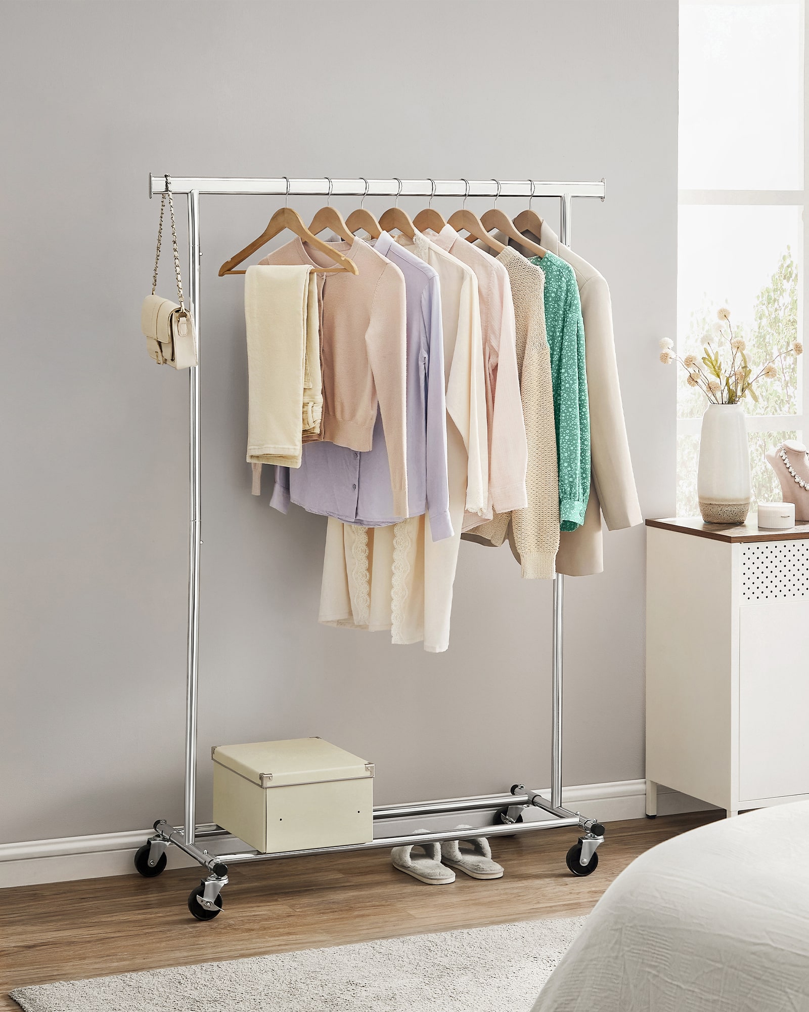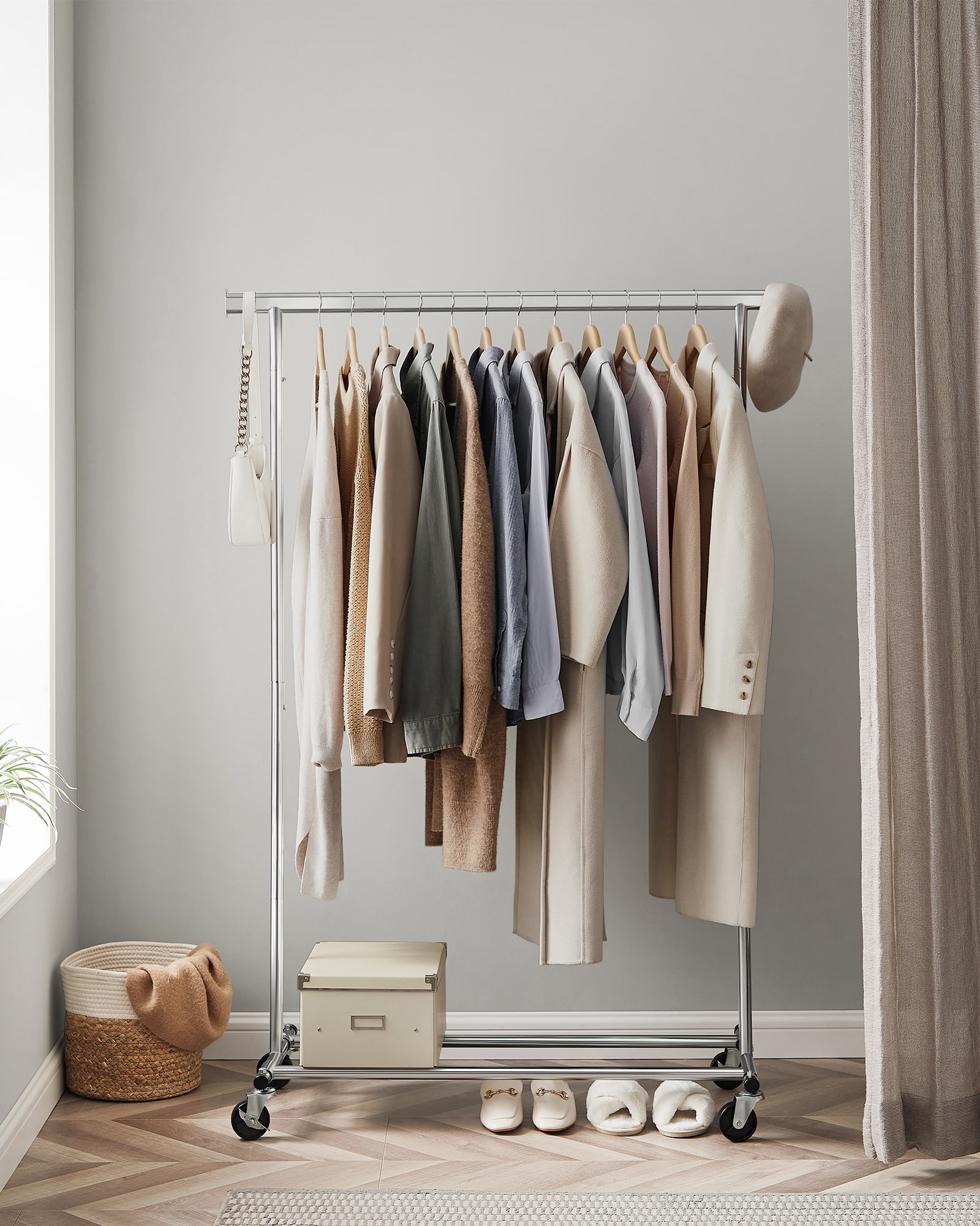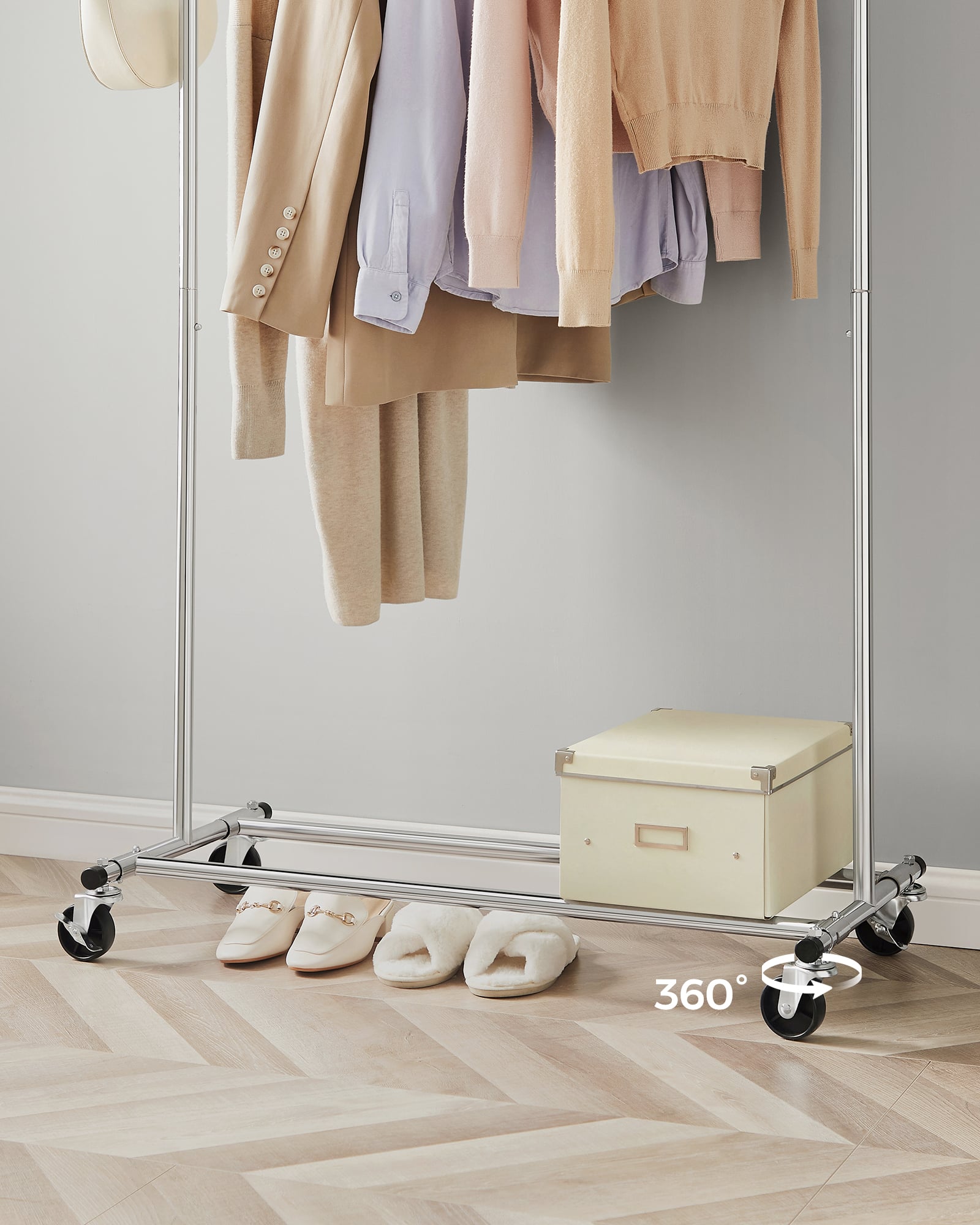 Dit stevige en duurzame kledingrek op wieltjes is ideaal voor het opbergen van zware kleding en accessoires. Met 4 draaibare wielen en extra opbergruimte is het rek eenvoudig te verplaatsen en handig in gebruik. Eenvoudig te monteren.