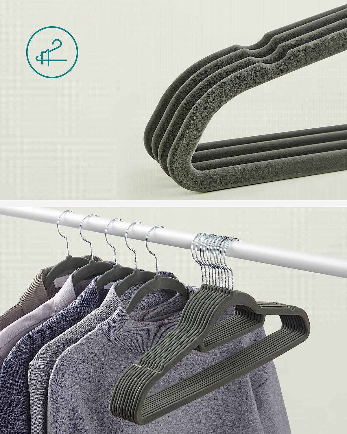 Bullet Point 2 | Ruimtebesparend ontwerp: de hangers zijn slechts 0,5 cm dik en nemen daarom weinig ruimte in de garderobe in beslag.Bovendien zijn ze erg robuust en niet gemakkelijk te breken |