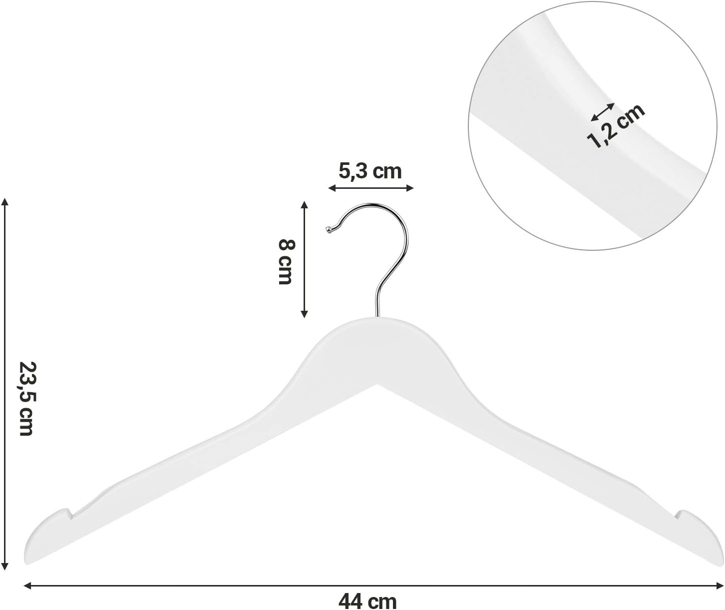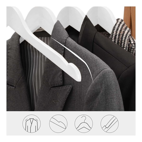 Bullet Point 3 | Sterke grip: Hoogwaardige materialen spreken voor zich. Gemaakt van massief esdoornhout, elk van de 20 beugels kan tot 5 kg worden belast. Dus of je nu zware winterjassen of leren jacks wilt ophangen, ga je gang, de hangers kunnen het aan! |