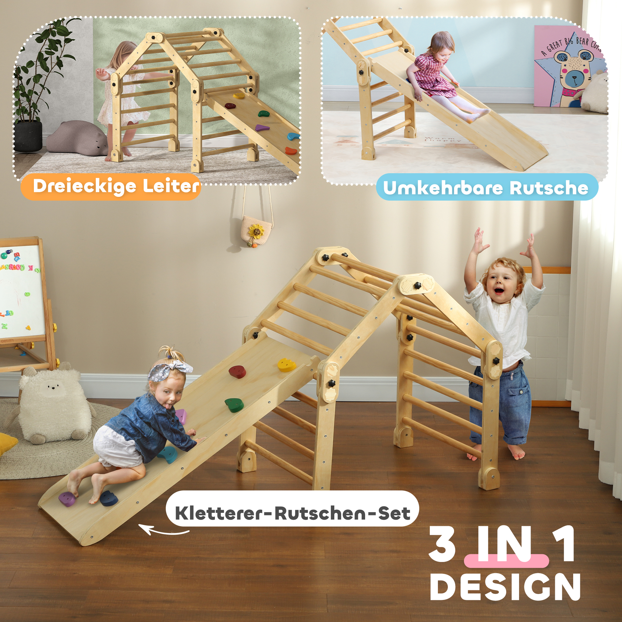 Op zoek naar een leuke en uitdagende speelervaring voor uw kinderen? Met het 3-in-1 klimrek in naturel kleur kunnen uw kinderen genieten van urenlang speelplezier in huis. Dit multifunctionele klimrek is ontworpen met een verstelbare klimladder en een omkeerbare glijbaan die ook als klimwand kan worden gebruikt. Gemaakt van hoogwaardig hout, biedt dit klimrek niet alleen leuk spel, maar ook ondersteuning bij de ontwikkeling van motorische vaardigheden.